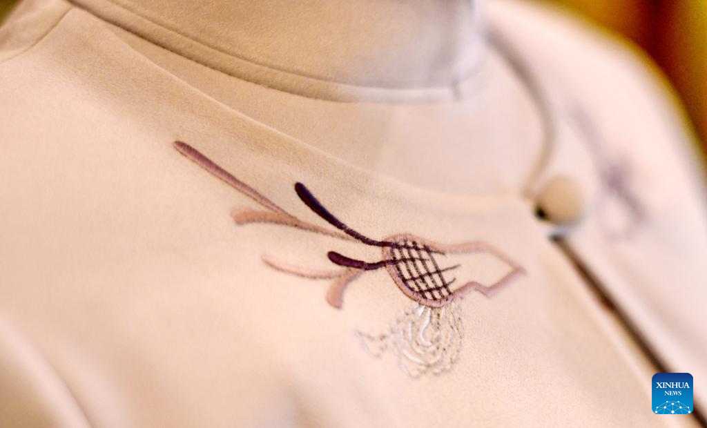 This photo taken on June 24, 2025 shows embroidered patterns on a set of customized clothes displayed at the flagship store of Longqingxiang in Beijing, capital of China. (Xinhua/Li Xin)