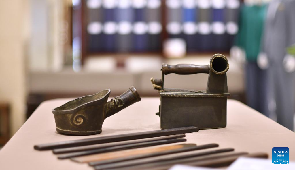 This photo taken on June 10, 2025 shows ancient tools for making clothes displayed at the flagship store of Longqingxiang in Beijing, capital of China. (Xinhua/Li Xin)