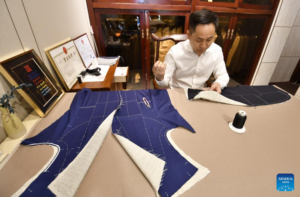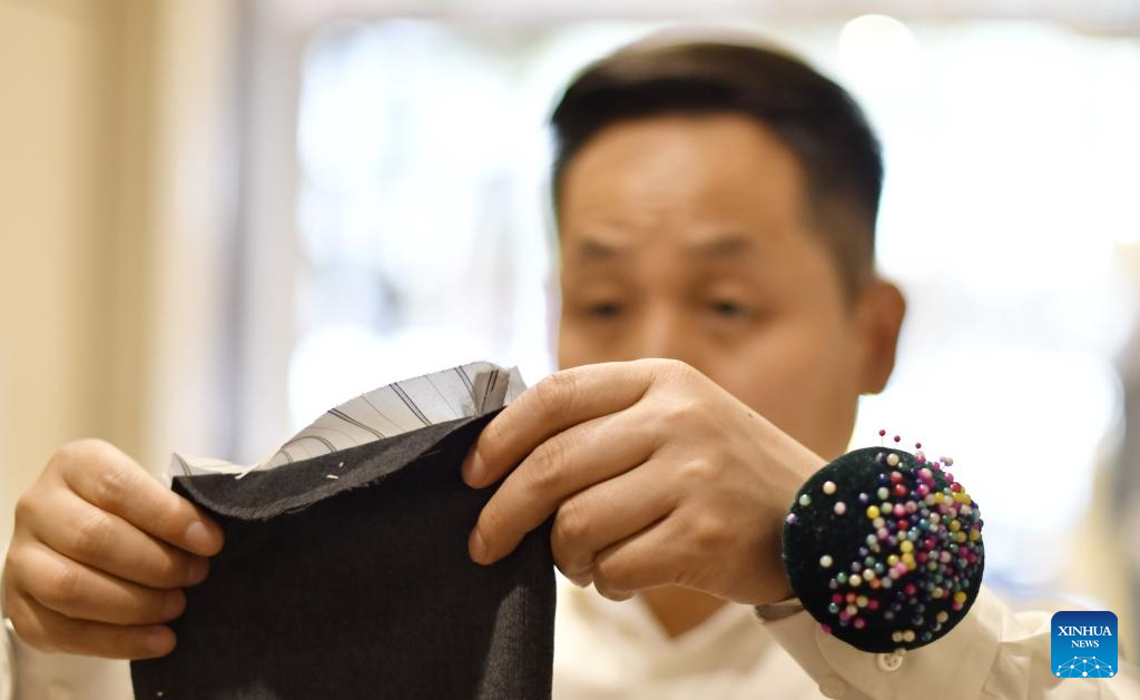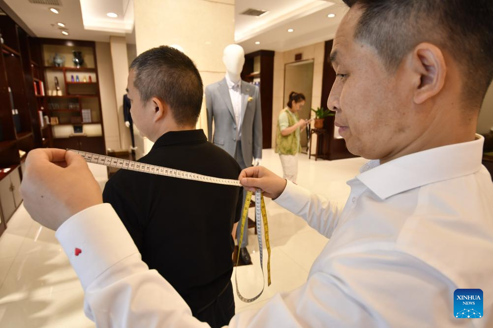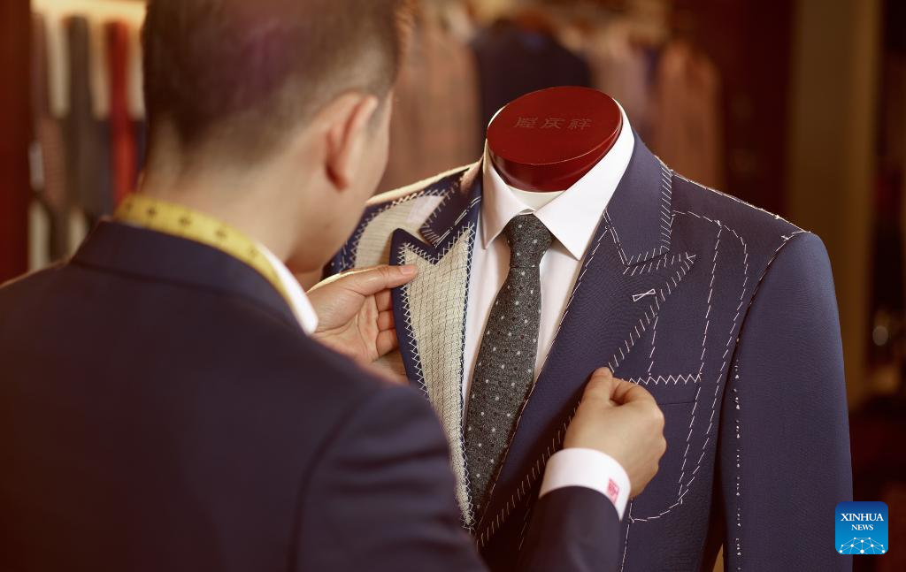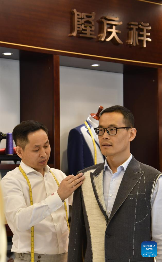 A senior tailor adjusts a set of customized sample clothes at the flagship store of Longqingxiang in Beijing, capital of China, June 24, 2025. (Xinhua/Li Xin)