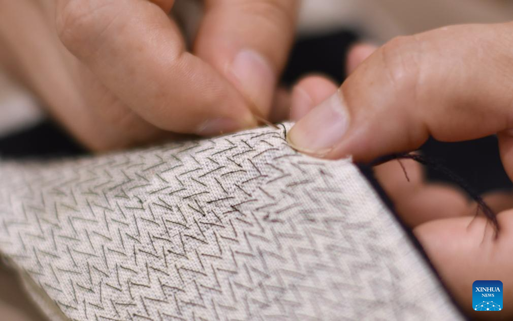 Li Wei demonstrates traditional sewing skills on western-style clothes at the flagship store of Longqingxiang in Beijing, capital of China, June 10, 2025. (Xinhua/Li Xin)