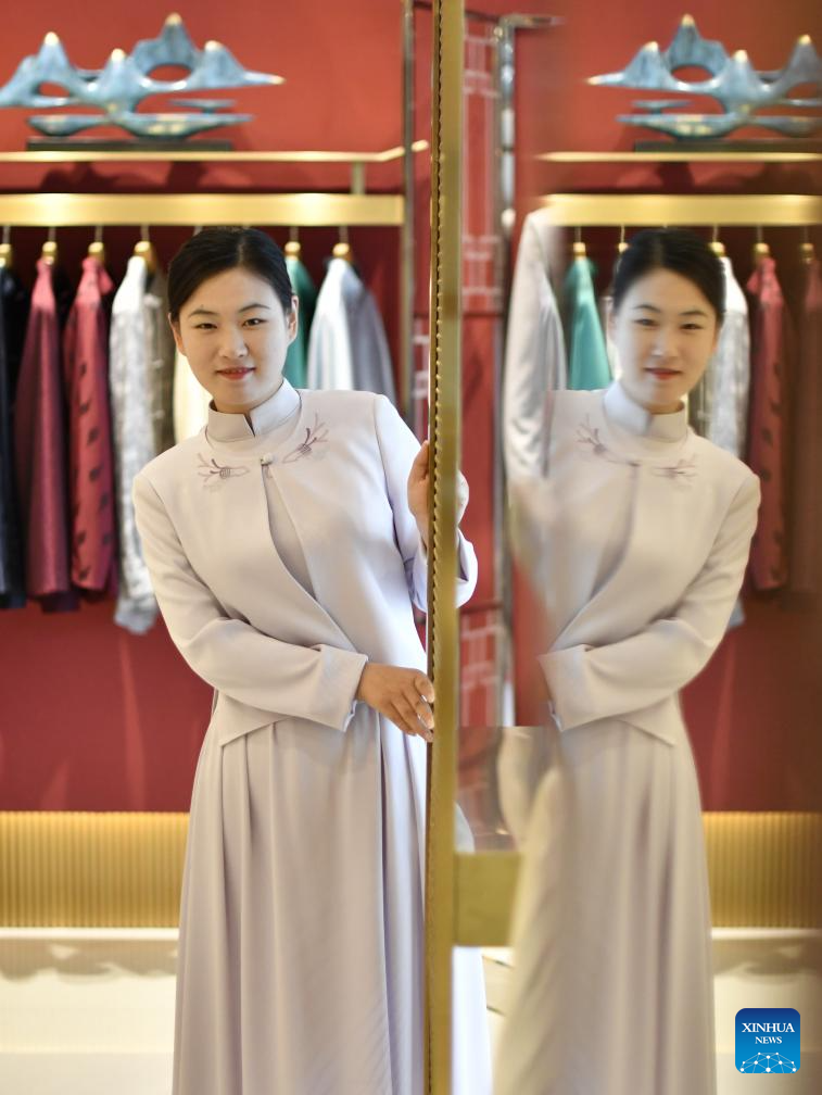 A staff member displays a set of customized sample dress at the flagship store of Longqingxiang in Beijing, capital of China, June 24, 2025. (Xinhua/Li Xin)