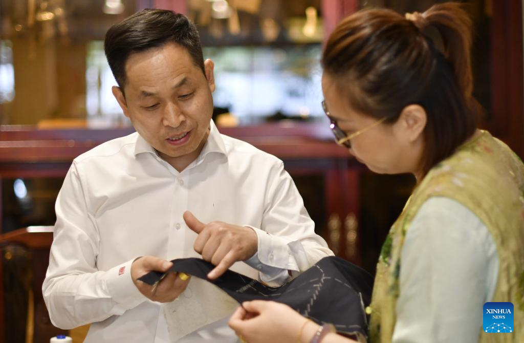 Li Wei (R) introduces clothing materials for a customer at the flagship store of Longqingxiang in Beijing, capital of China, June 10, 2025. (Xinhua/Li Xin)