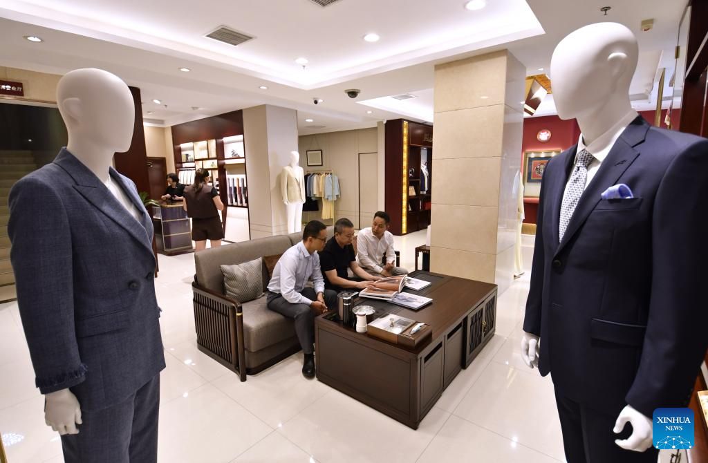Customers learn about making procedures of customized western-style clothes at the flagship store of Longqingxiang in Beijing, capital of China, June 10, 2025.