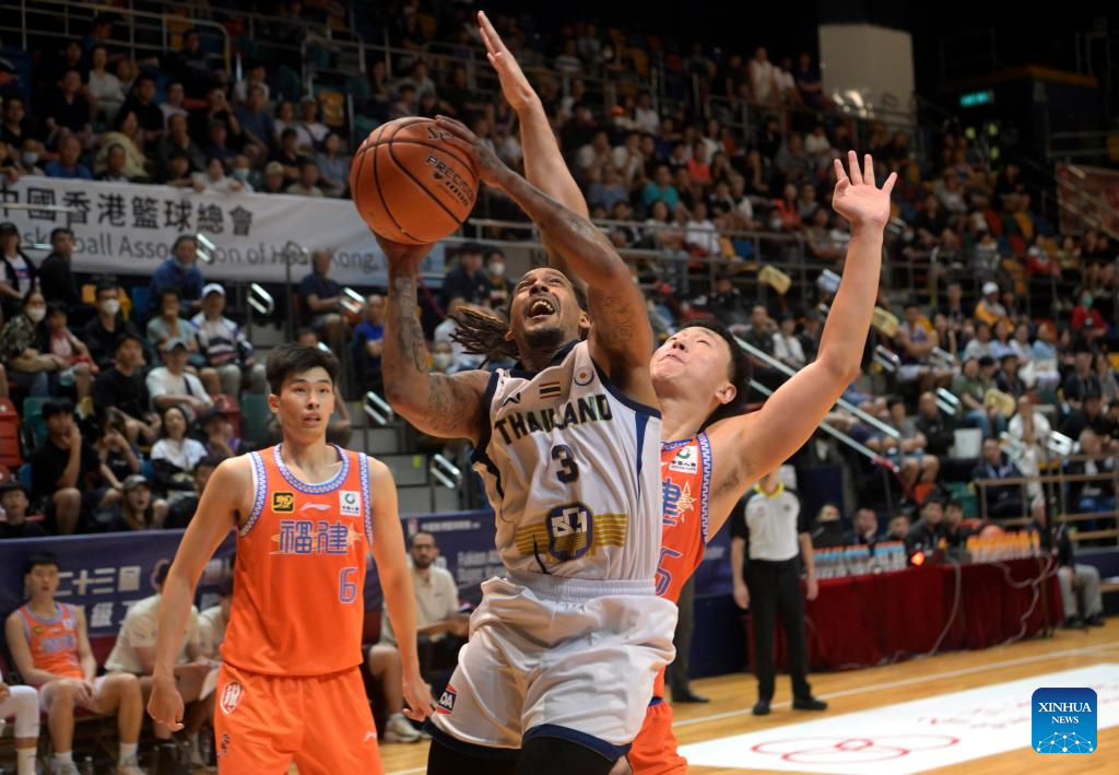 Frederick Lee Jones Lish (C) of Thailand competes during the Super Kung Sheung International Basketball Invitation Championship final match between Thailand and Fujian Jinjiang Culture & Tourism in Hong Kong, China, June 29, 2025. (Xinhua/Lo Ping Fai)