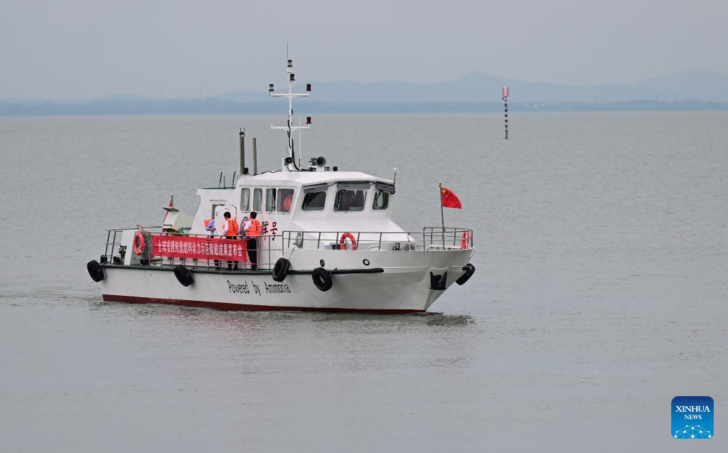 This photo taken on June 28, 2025 shows the world's first pure ammonia-powered demonstration vessel, the "Anhui," making its maiden voyage at the water area of Chaohu Lake in Hefei, east China's Anhui Province.