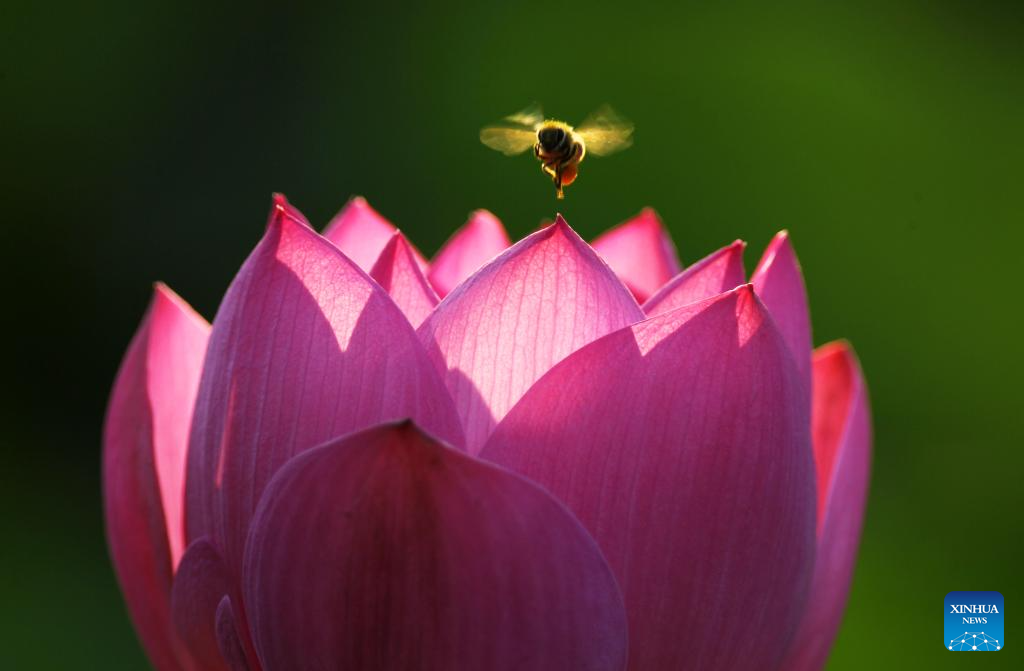 A bee flies over a lotus flower at a moat in Xuchang City, central China's Henan Province, on June 27, 2025. (Photo by Niu Shupei/Xinhua)