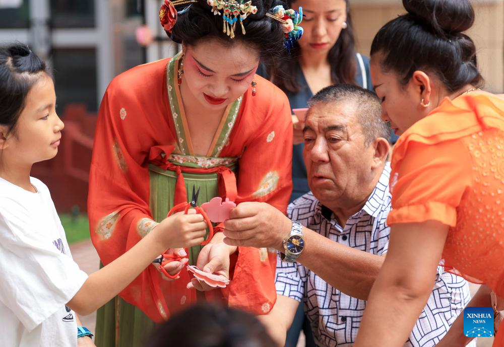 Residents participate in an intangible heritage activity at Xinjiang Open University for Seniors in Urumqi, northwest China's Xinjiang Uygur Autonomous Region, June 27, 2025. A graduation ceremony was held at Xinjiang Open University for Seniors on Friday to celebrate the graduation of its students. The event offered a stage for the elderly students to show their learning achievements, which also attracted their relatives, friends and local residents to take part in with various cultural activities.