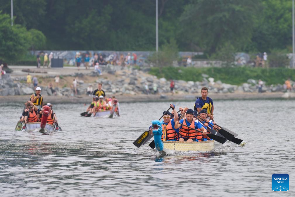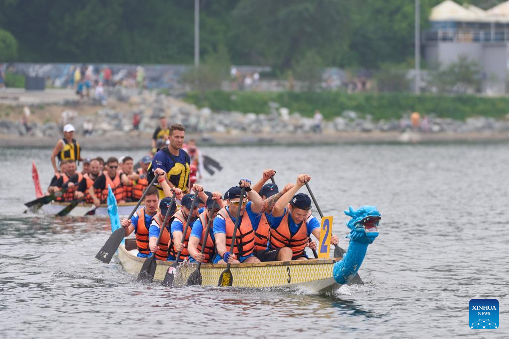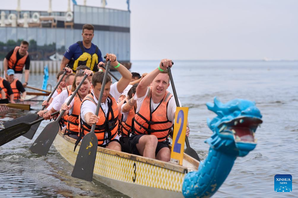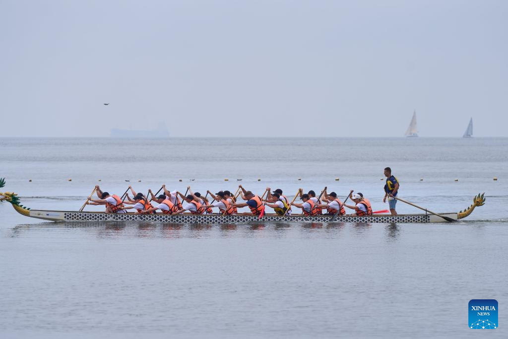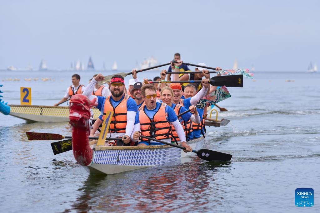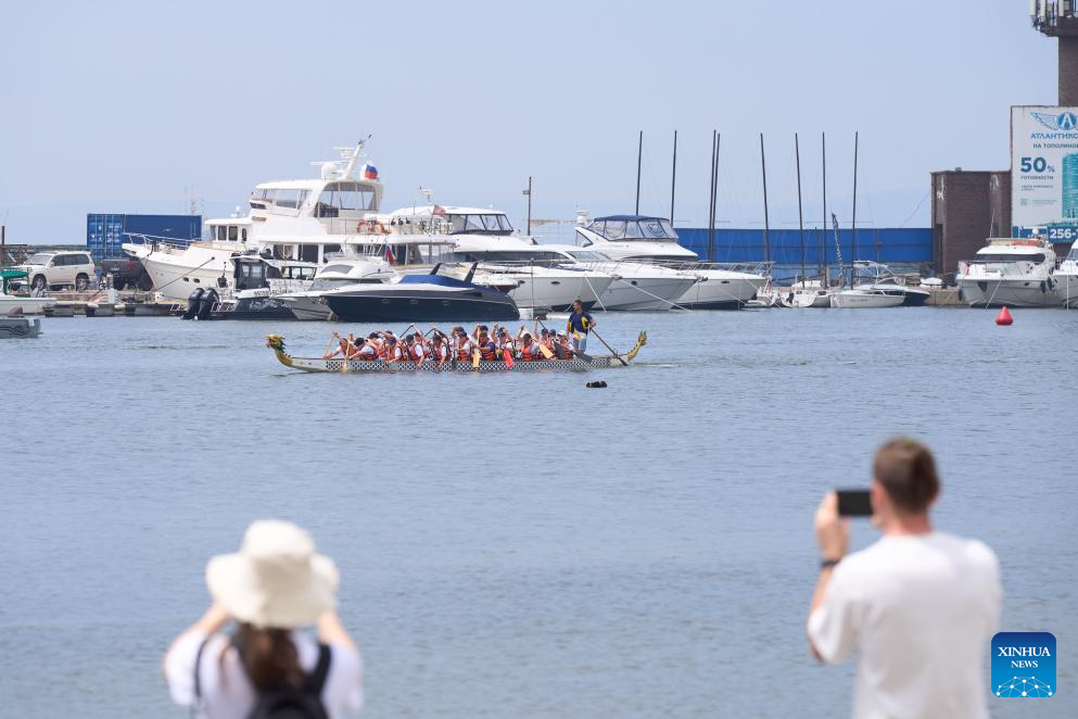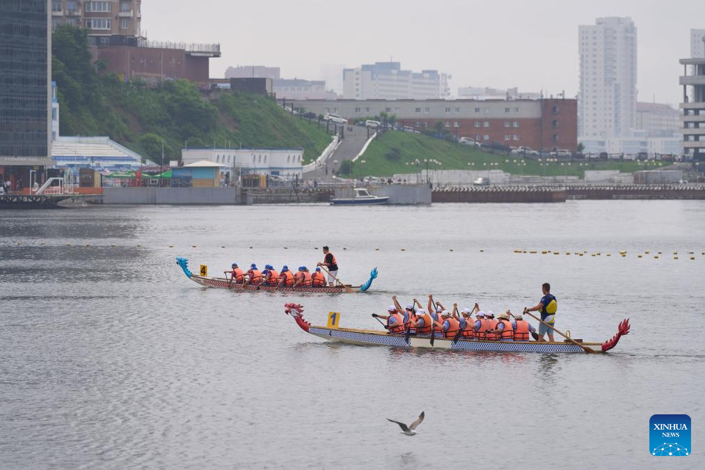People participate in a dragon boat race in Vladivostok, Russia, June 29, 2025. A total of 21 teams took part in the dragon boat race in Vladivostok on Sunday. (Photo by Guo Feizhou/Xinhua)
