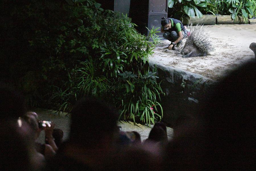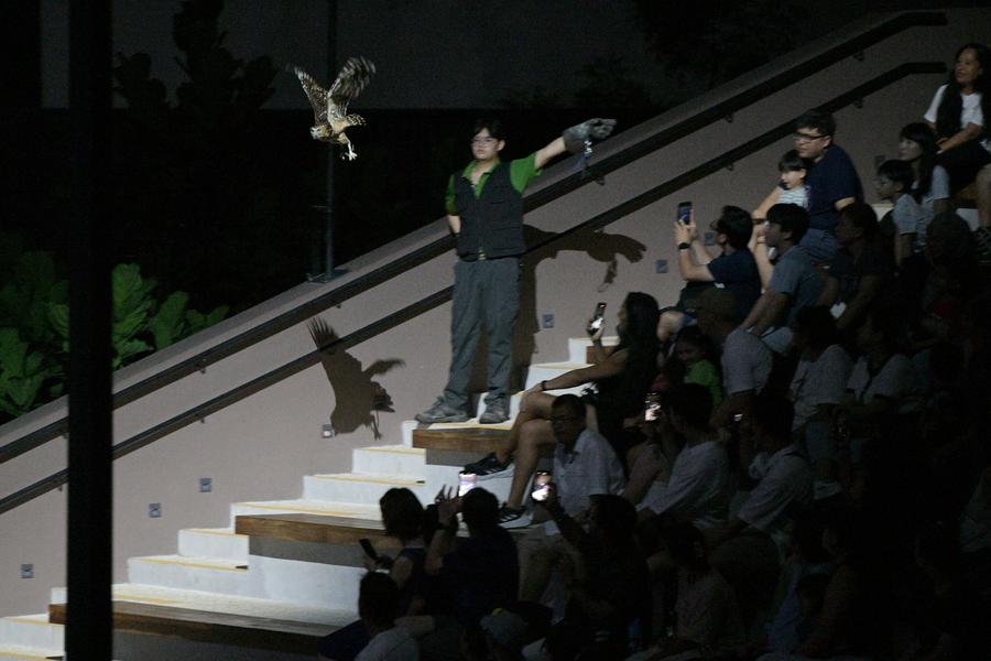 Tourists view the flying performance of a buffy fish owl at Singapore Night Safari in Singapore, June 23, 2025.Tourists learn about characteristics of the porcupine during an animal performance in the amphitheatre of Singapore Night Safari in Singapore, June 23, 2025.