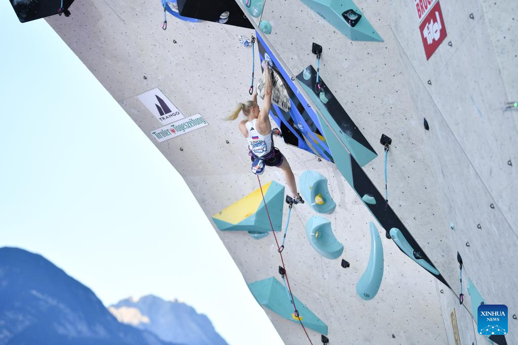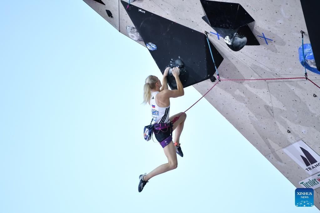 Janja Garnbret of Slovenia competes during the women's lead final at the International Federation of Sport Climbing (IFSC) World Cup in Innsbruck, Austria, June 29, 2025. (Xinhua/Lian Yi)