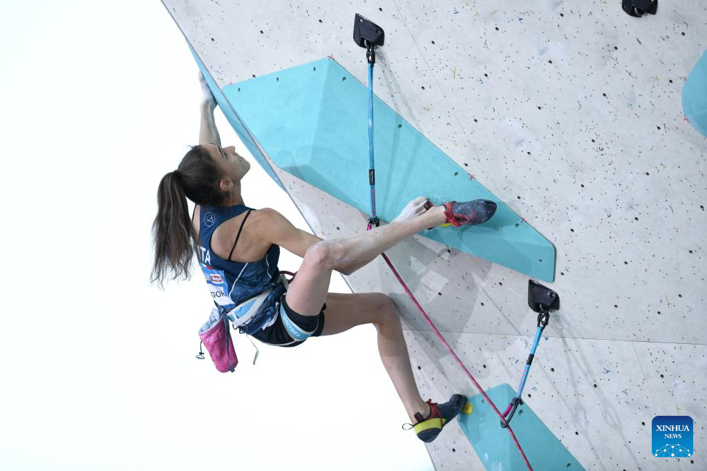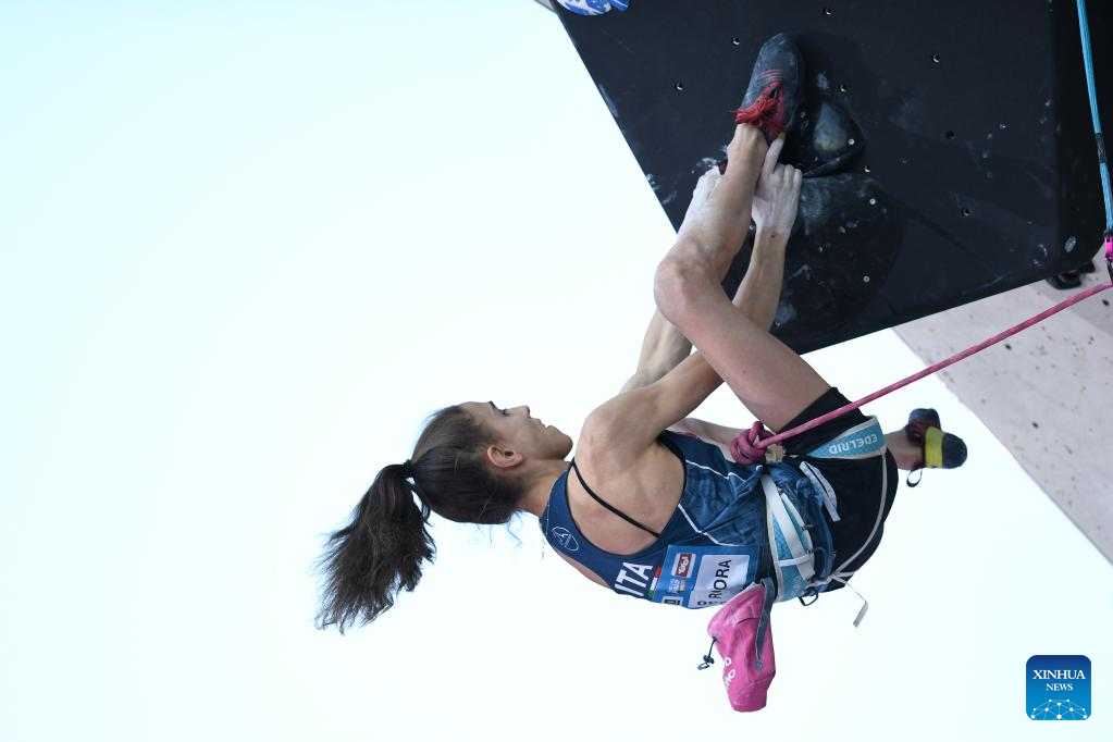 Laura Rogora of Italy competes during the women's lead final at the International Federation of Sport Climbing (IFSC) World Cup in Innsbruck, Austria, June 29, 2025. (Xinhua/Lian Yi)