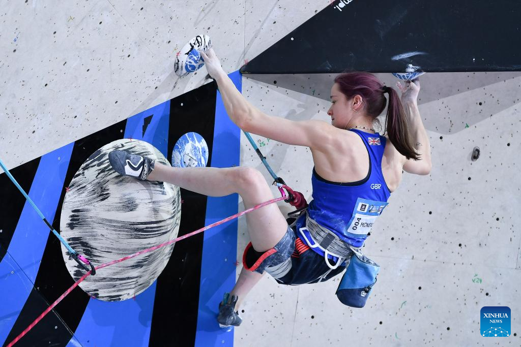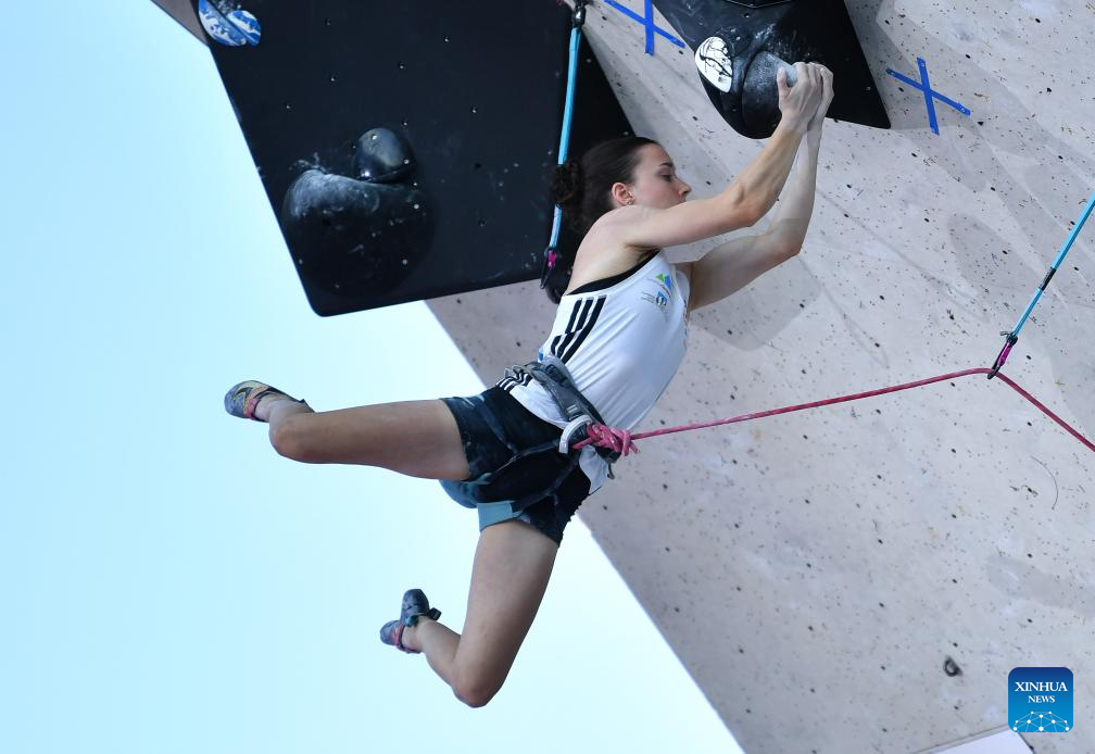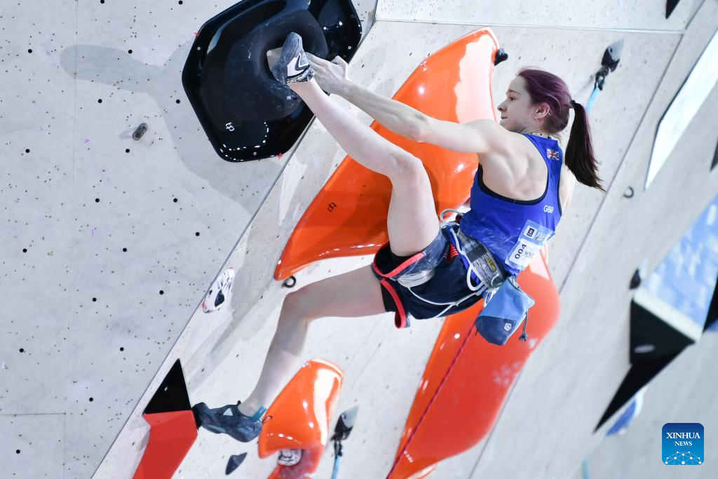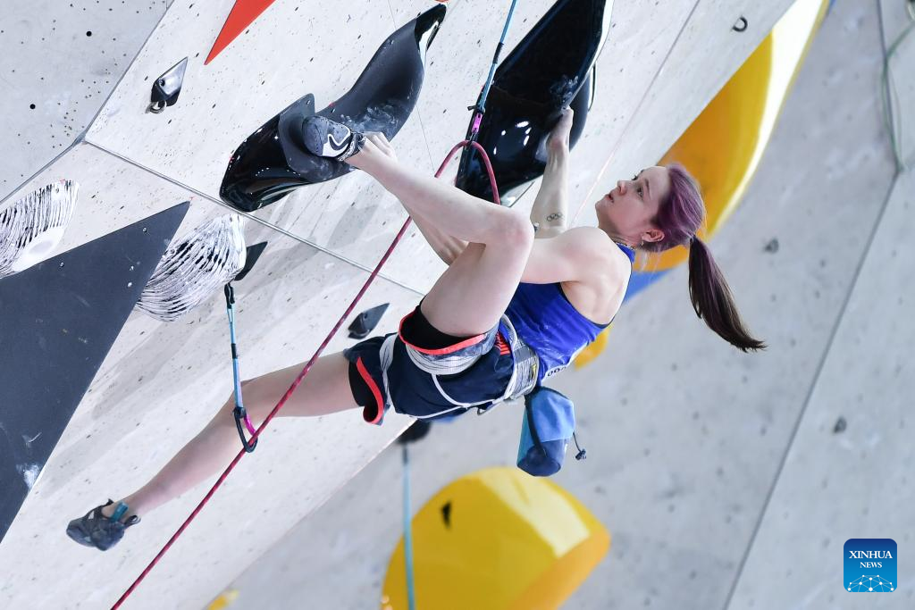 Erin McNeice of Great Britain competes during the women's lead final at the International Federation of Sport Climbing (IFSC) World Cup in Innsbruck, Austria, June 29, 2025. (Xinhua/Lian Yi)