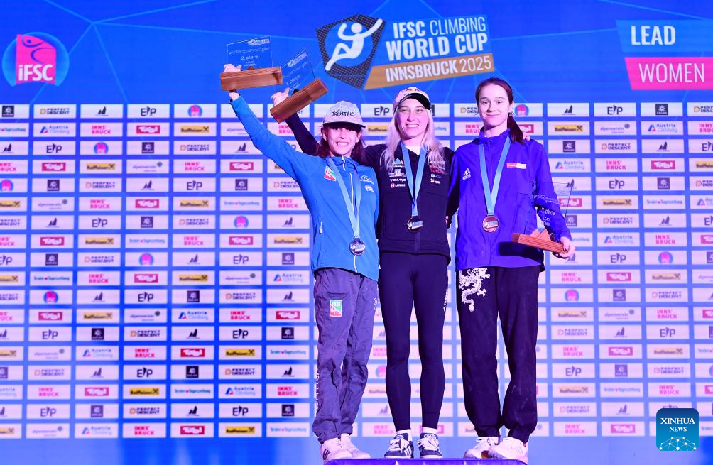 Gold medalist Janja Garnbret of Slovenia (C), silver medalist Laura Rogora (L) of Italy, and bronze medalist Erin McNeice of Great Britain attend the awarding ceremony after the women's lead final at the International Federation of Sport Climbing (IFSC) World Cup in Innsbruck, Austria, June 29, 2025. (Xinhua/Lian Yi)