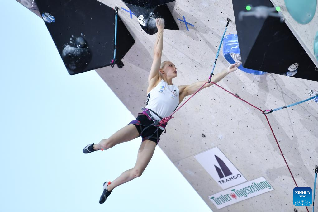 Annie Sanders of the United States competes during the women's lead final at the International Federation of Sport Climbing (IFSC) World Cup in Innsbruck, Austria, June 29, 2025. (Xinhua/Lian Yi)