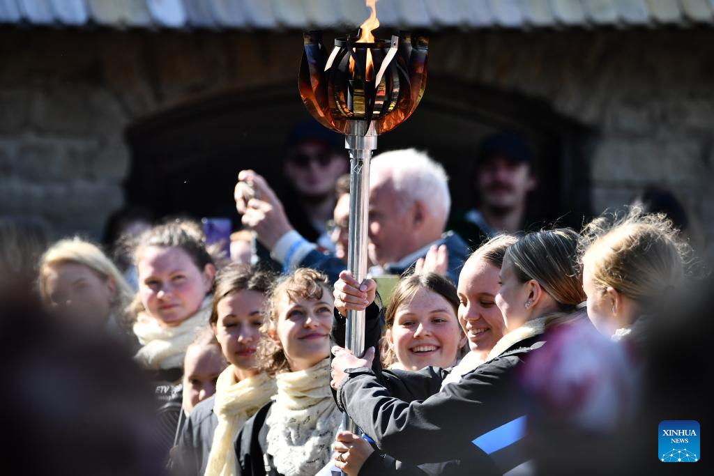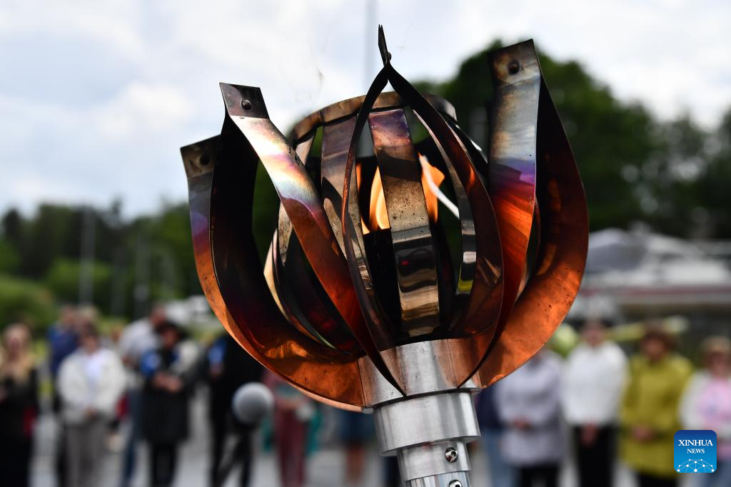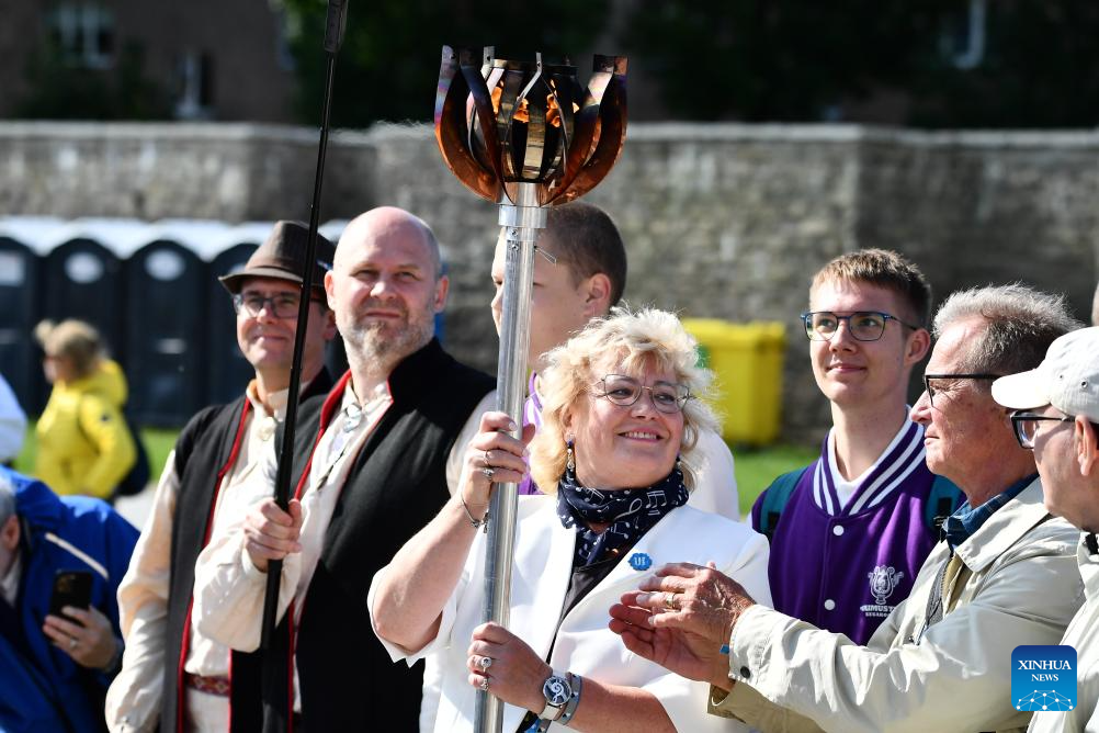 The torch of the festival flame is pictured in Narva, Estonia, June 29, 2025. The Estonian National Song and Dance Celebration is one of the largest and most important cultural events in Estonia.