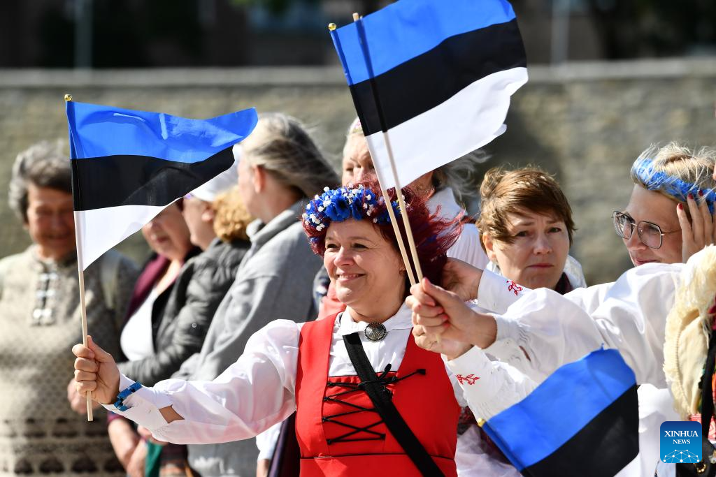 People waving Estonian flags greet the arrival of the festival flame in Narva, Estonia, June 29, 2025. The Estonian National Song and Dance Celebration is one of the largest and most important cultural events in Estonia.