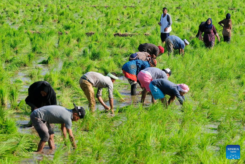 Farmers plant rice seedlings at a field in Sharqia Governorate, Egypt, on July 1, 2025. Despite challenges such as water scarcity, rice cultivation remains a vital source of income for many farmers in northern Egypt. (Xinhua/Ahmed Gomaa)