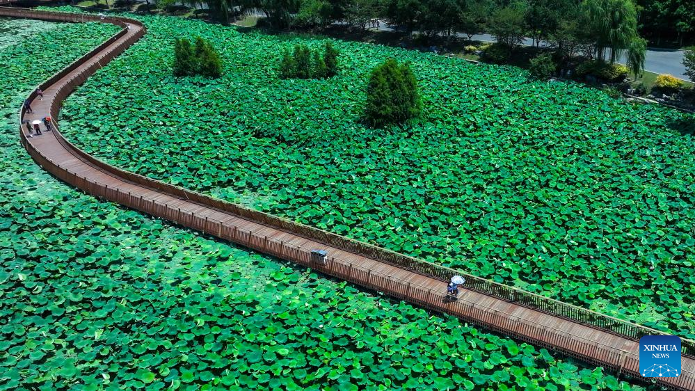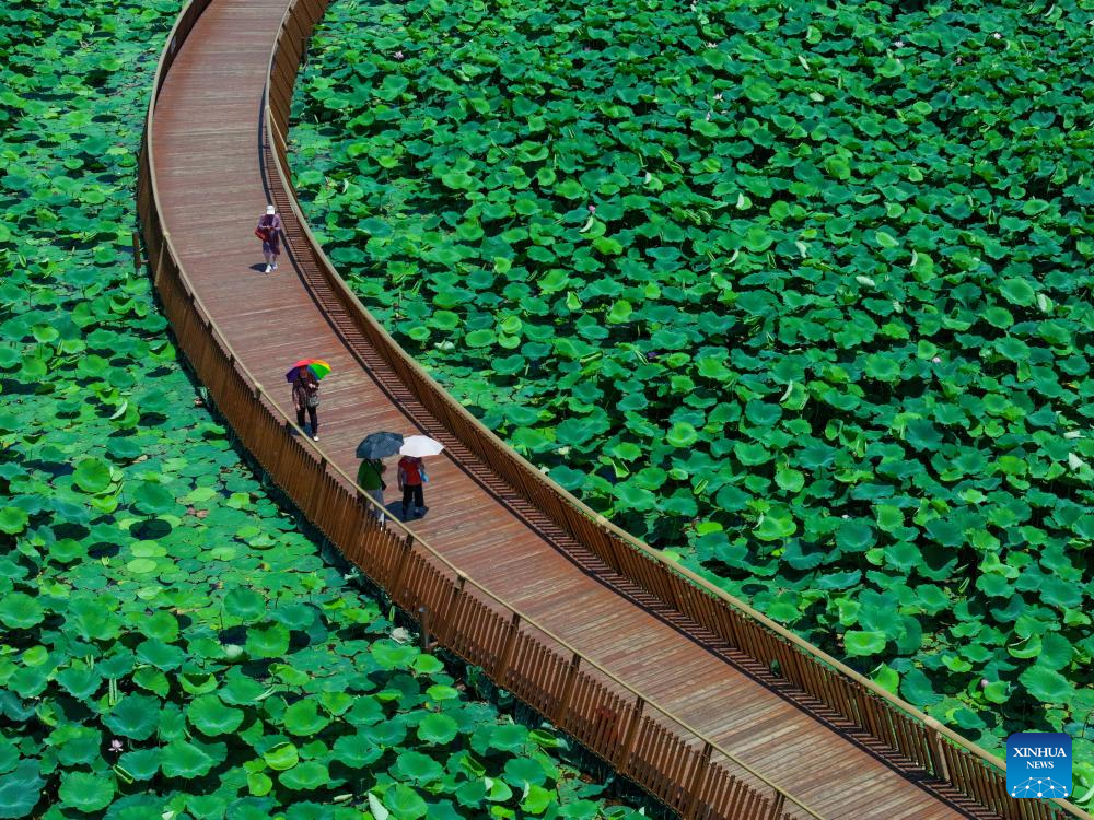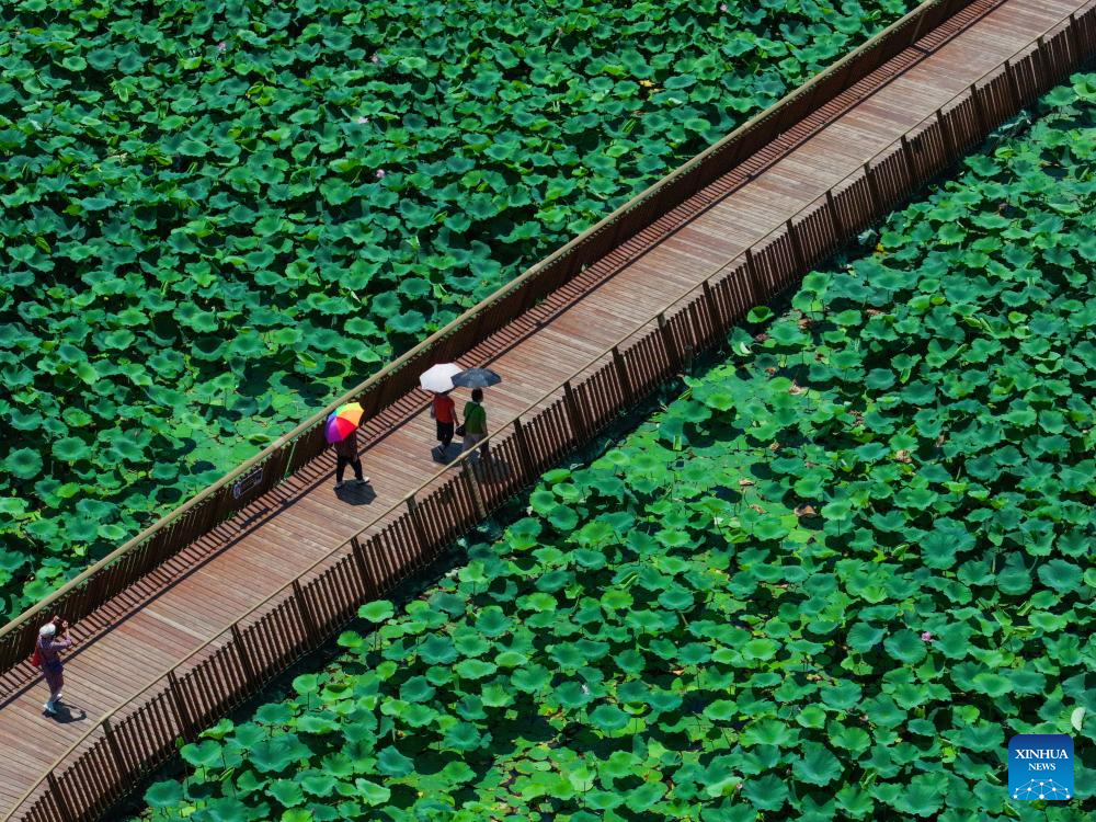 An aerial drone photo taken on July 1, 2025 shows people walking on a plank road to enjoy lotus flowers at the Xuanwu Lake Park in Nanjing, east China's Jiangsu Province. (Xinhua/Li Bo)