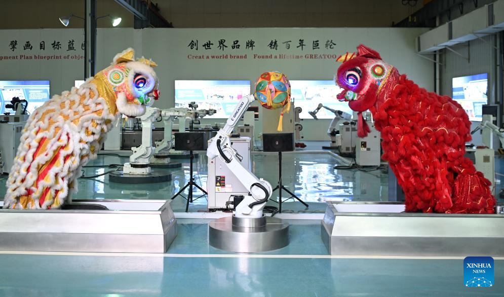 This photo taken on June 29, 2025 shows two industrial robots performing lion dance at Greatoo Intelligent in Jieyang, south China's Guangdong Province.