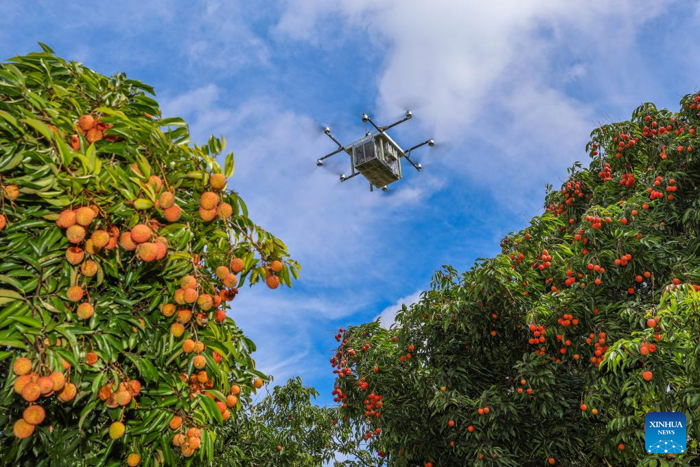 This photo taken on June 28, 2025 shows a logistics drone carrying newly-picked lychees out of an orchard in Guangzhou, south China's Guangdong Province. (Xinhua/Liu Dawei)