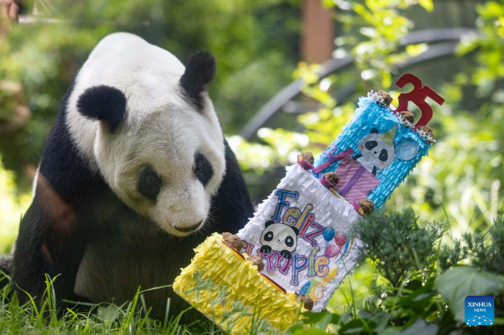 Giant panda Xin Xin is pictured with her symbolized birthday cake at Chapultepec Zoo in Mexico City, capital of Mexico, on June 29, 2025. In 1975, the Chinese government gifted two giant pandas, Ying Ying and Pe Pe, to the Mexican government. Their descendant, Xin Xin, was born in Mexico on July 1, 1990. (Xinhua/Li Mengxin)