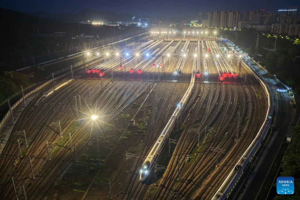 An aerial drone photo taken on June 30, 2025 shows a bullet train running out of a maintenance station in Nanjing, east China's Jiangsu Province. A new train schedule is put into effect in China from July 1, 2025. (Photo by Fang Dongxu/Xinhua)