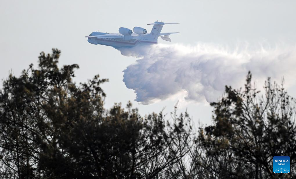 An aircraft puts out a fire in the Seferihisar district of Izmir, Türkiye, on June 30, 2025. Türkiye has evacuated more than 50,000 people from regions affected by forest fires across the country, with the western province of Izmir accounting for the majority of evacuations, the country's disaster agency said on Monday. (Mustafa Kaya/Handout via Xinhua)