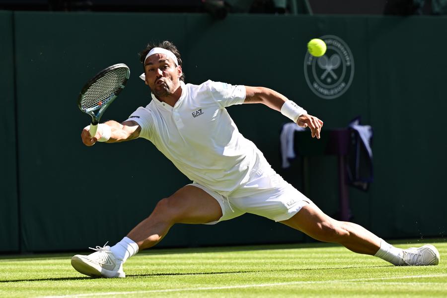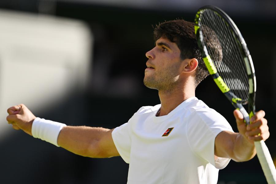 LONDON, July 1 (Xinhua) -- Men's singles defending champion Carlos Alcaraz was dragged into a five-set marathon battle by Italy's Fabio Fognini, as the Spaniard needed four hours and 37 minutes to progress from the first round at Wimbledon 7-5, 6-7(5) 7-5, 2-6, 6-1 here on Monday.
