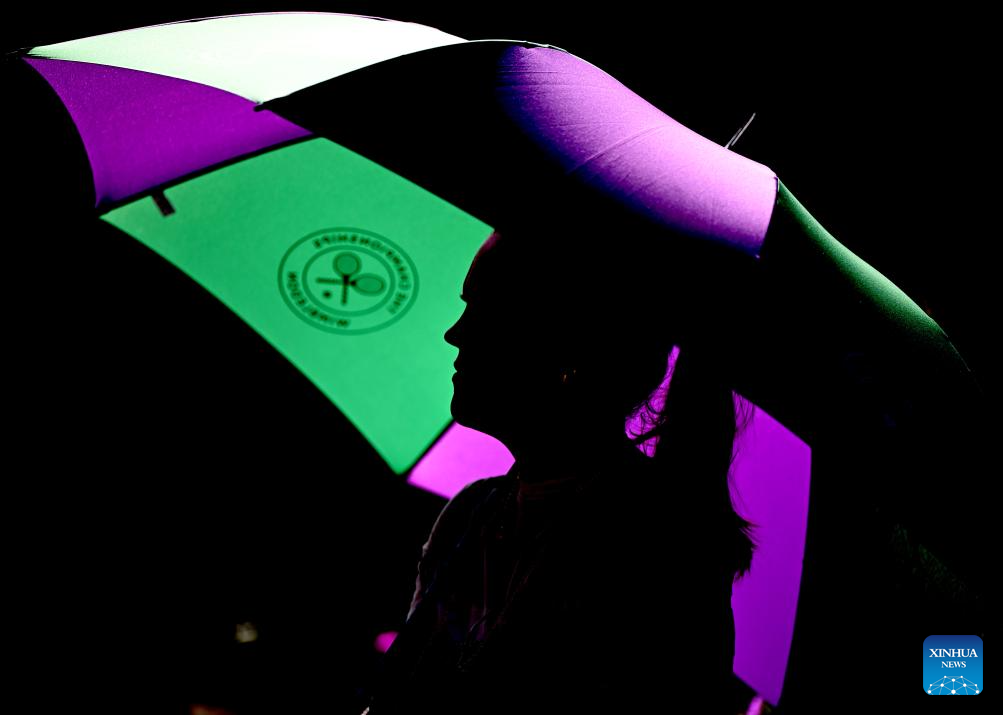 A woman shelters herself from the sun on the opening day of the Wimbledon Championships in London, Britain, June 30, 2025. Tennis fans faced the hottest start to Wimbledon on record on Monday as temperature soared to 32 degrees Celsius. (Xinhua/Li Ying)