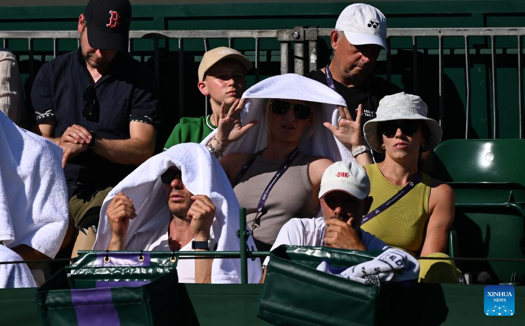 Spectators protect their faces from the sun with hats and towels on the opening day of the Wimbledon Championships in London, Britain, June 30, 2025. Tennis fans faced the hottest start to Wimbledon on record on Monday as temperature soared to 32 degrees Celsius. (Xinhua/Li Ying)