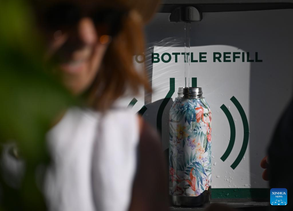 A woman walks past an auto bottle refilling station on the opening day of the Wimbledon Championships in London, Britain, June 30, 2025. Tennis fans faced the hottest start to Wimbledon on record on Monday as temperature soared to 32 degrees Celsius. (Xinhua/Li Ying)