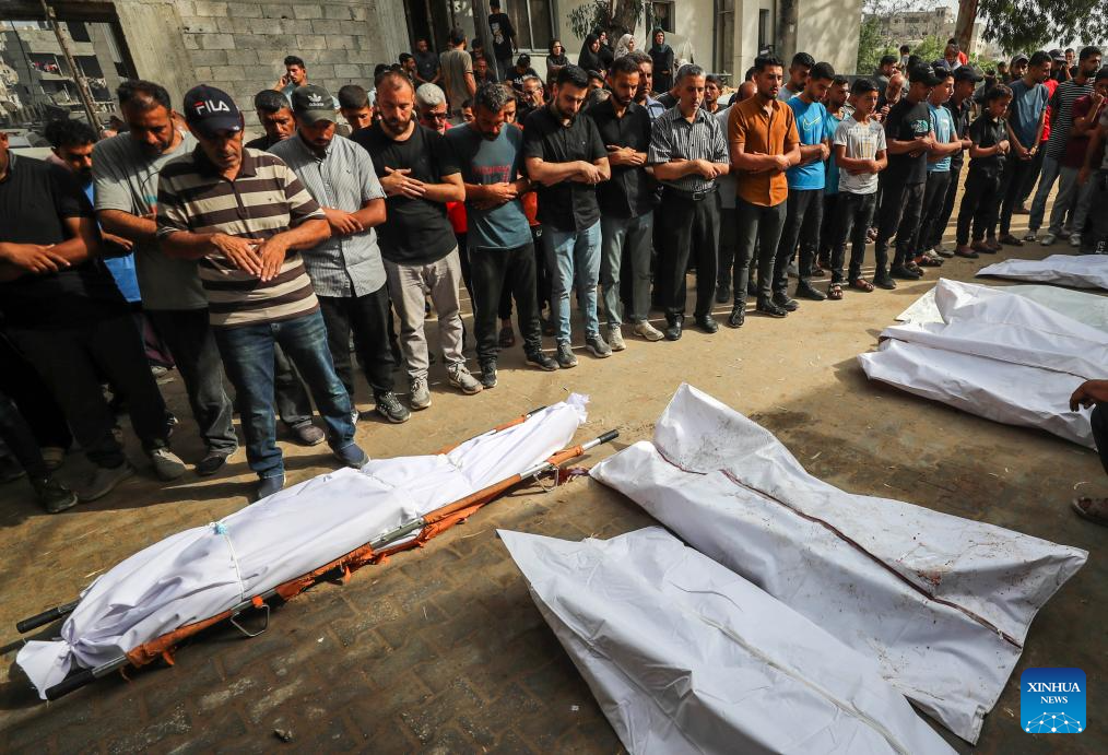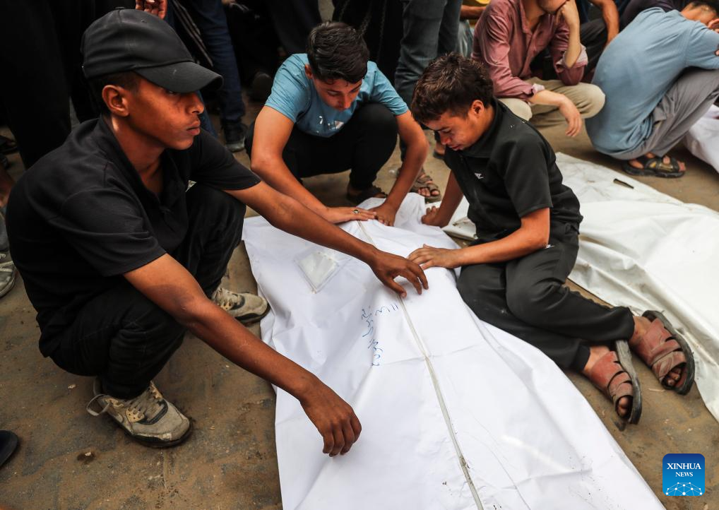 Palestinians pray over victims who were killed in Israeli airstrikes, at a hospital in Gaza City, July 1, 2025. At least 45 Palestinians were killed by Israeli shelling and gunfire in the Gaza Strip on Tuesday, Gaza's Civil Defense said, while the Israeli army announced that it had attacked 140 targets in the coastal enclave over the past 24 hours. (Photo by Mahmoud Zaki/Xinhua)