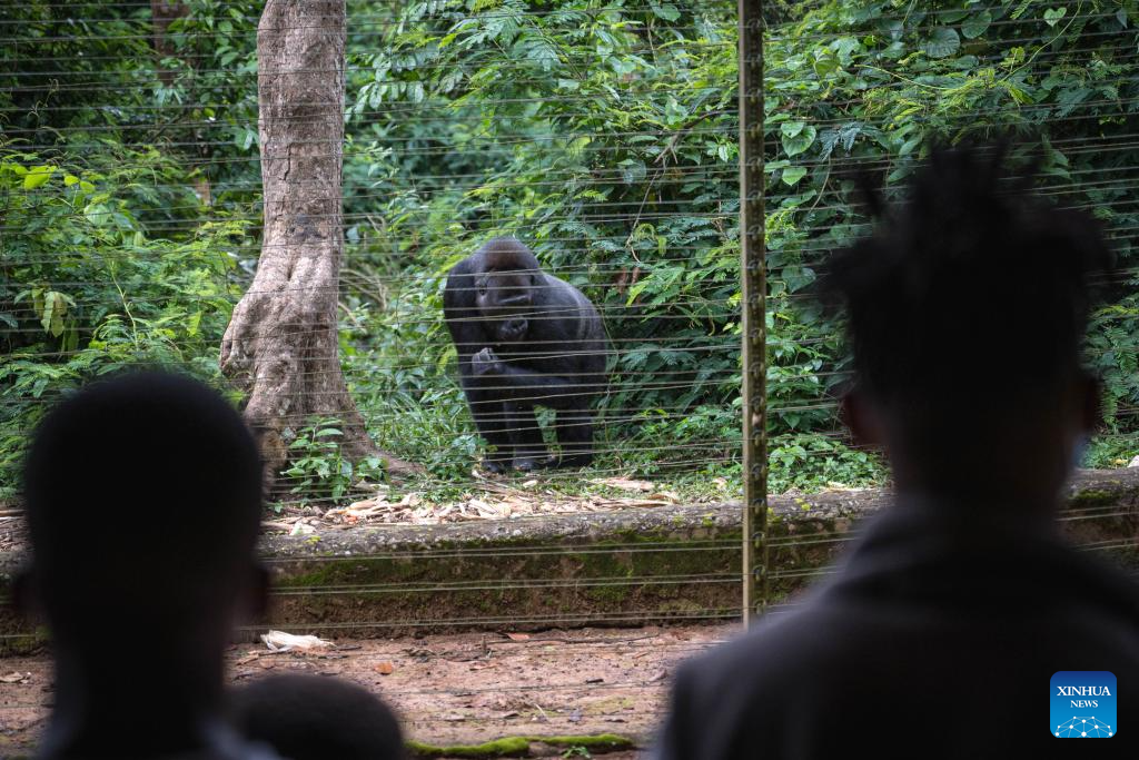 This photo taken on July 1, 2025 shows a western lowland gorilla at the Mofu Primate Sanctuary in Yaounde, the capital of Cameroon. Located in the south of Yaounde, the Mofu Primate Sanctuary aims to protect primates that have been maimed or left alone due to illegal hunting and trading. (Xinhua/Wang Guansen)