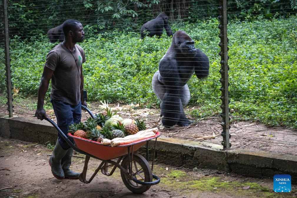 A staff member delivers food for western lowland gorillas at the Mefou Primate Sanctuary in Yaounde, the capital of Cameroon, on July 1, 2025. Located in the south of Yaounde, the Mofu Primate Sanctuary aims to protect primates that have been maimed or left alone due to illegal hunting and trading. (Xinhua/Wang Guansen)