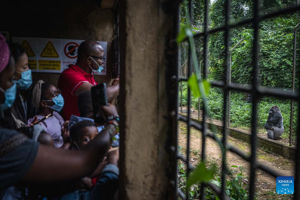 Tourists observe a western lowland gorilla at the Mefou Primate Sanctuary in Yaounde, the capital of Cameroon, on July 1, 2025. Located in the south of Yaounde, the Mofu Primate Sanctuary aims to protect primates that have been maimed or left alone due to illegal hunting and trading. (Xinhua/Wang Guansen)