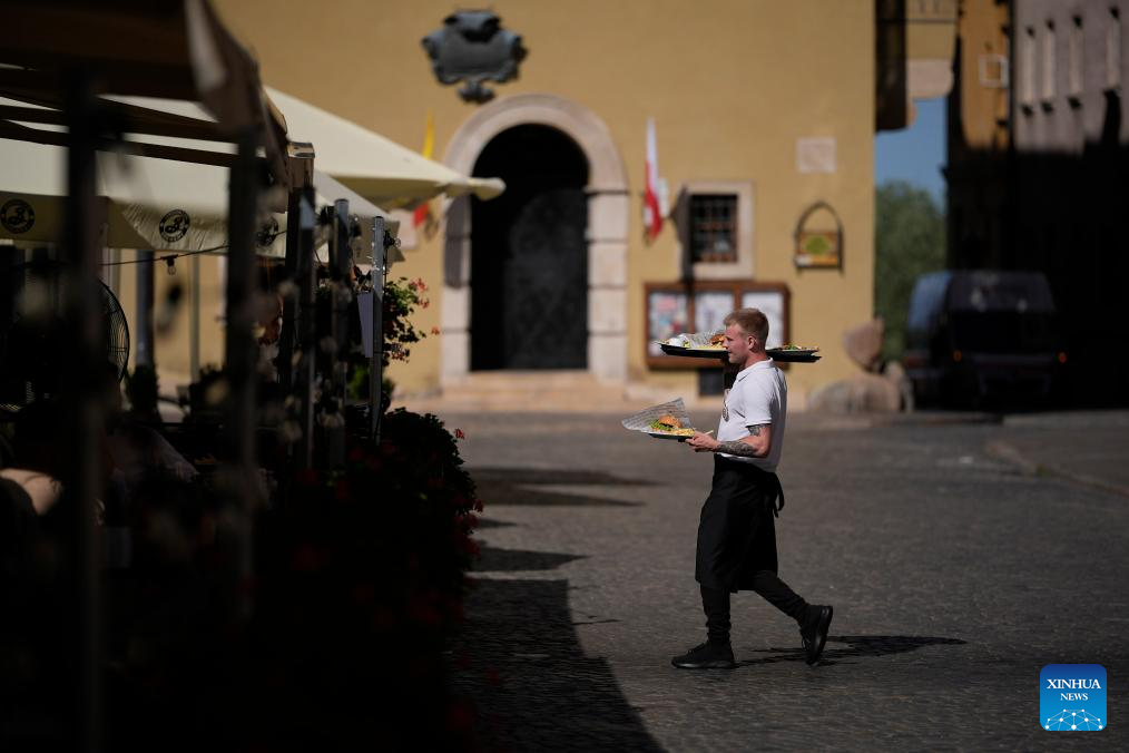A waiter serves food to customers at an outdoor restaurant in the Old Town of Warsaw, Poland, on July 1, 2025. Poland's meteorological authorities have issued heat warnings for much of the country this week. (Photo by Jaap Arriens/Xinhua)