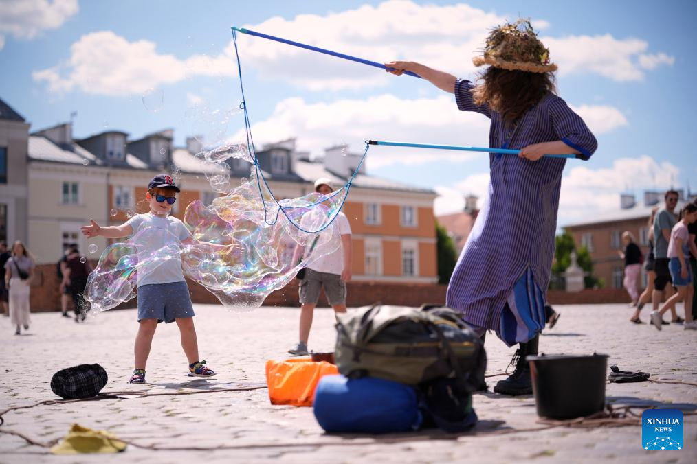 Children play with floating soap bubbles at the Royal Castle Square in Warsaw, Poland, on July 1, 2025. Poland's meteorological authorities have issued heat warnings for much of the country this week. (Photo by Jaap Arriens/Xinhua)