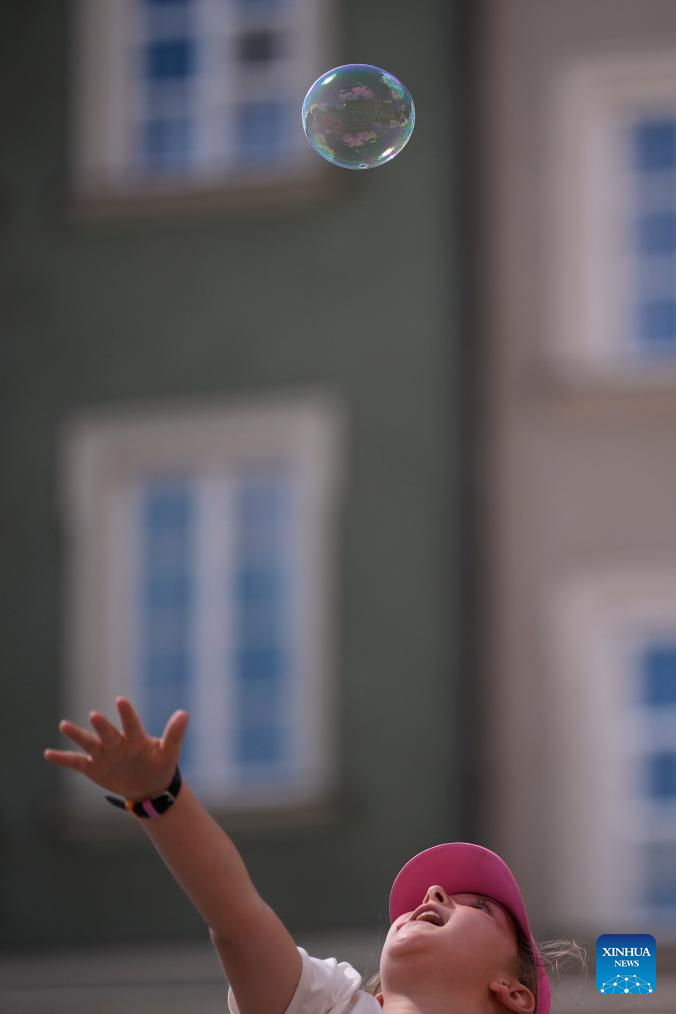 A child plays with floating soap bubbles at the Royal Castle Square in Warsaw, Poland, on July 1, 2025. Poland's meteorological authorities have issued heat warnings for much of the country this week. (Photo by Jaap Arriens/Xinhua)