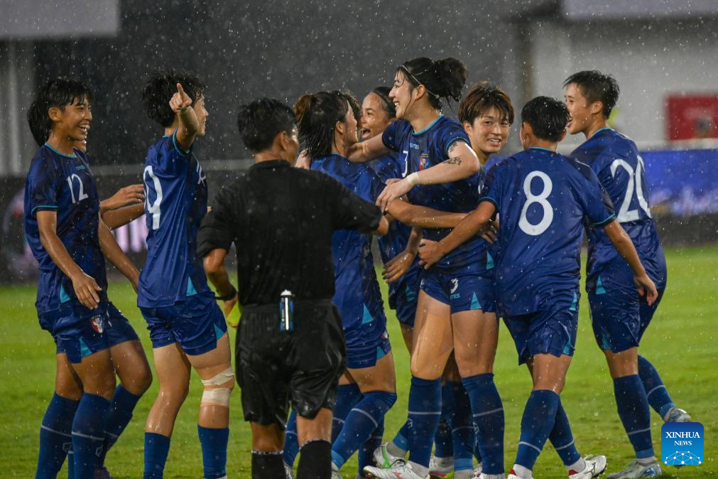 Players of Chinese Taipei celebrate after scoring during the AFC Women's Asian Cup 2026 Qualifiers Group D football match between Kyrgyzstan and Chinese Taipei in Tangerang, Indonesia, July 2, 2025. (Xinhua/Agung Kuncahya B.)