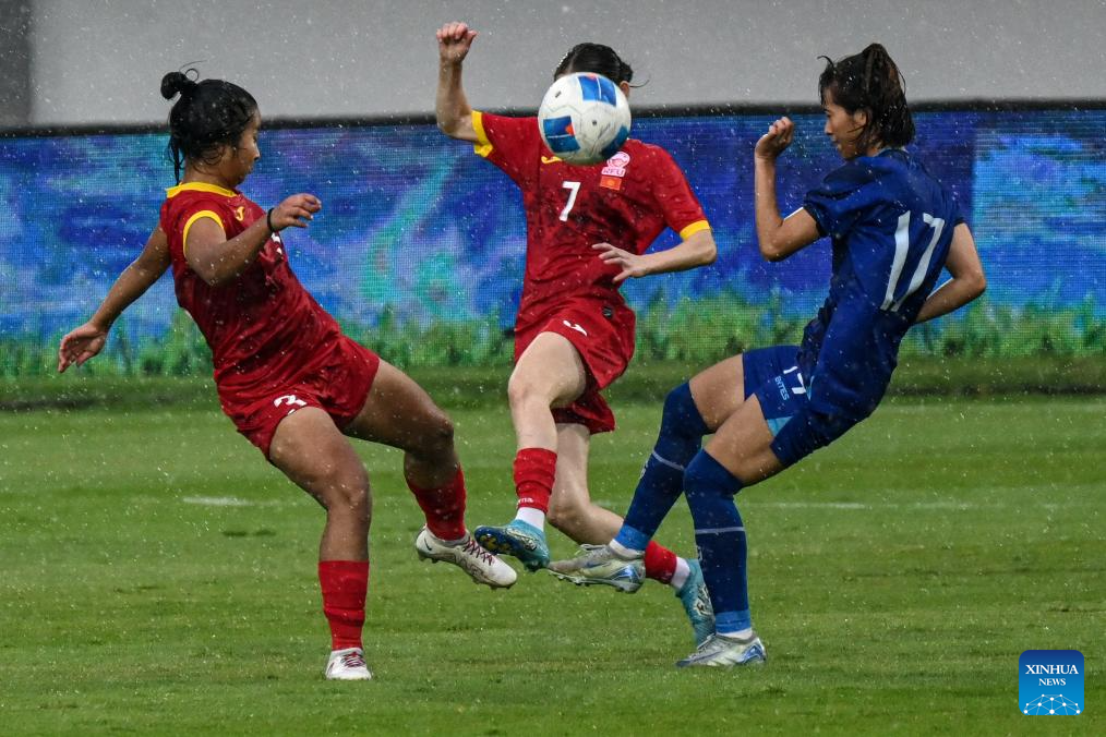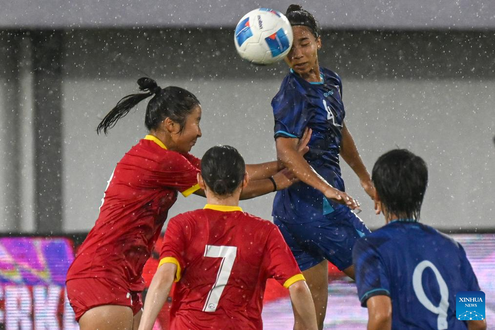 Tseng Yun-Ya (2nd R) of Chinese Taipei competes during the AFC Women's Asian Cup 2026 Qualifiers Group D football match between Kyrgyzstan and Chinese Taipei in Tangerang, Indonesia, July 2, 2025. (Xinhua/Agung Kuncahya B.)