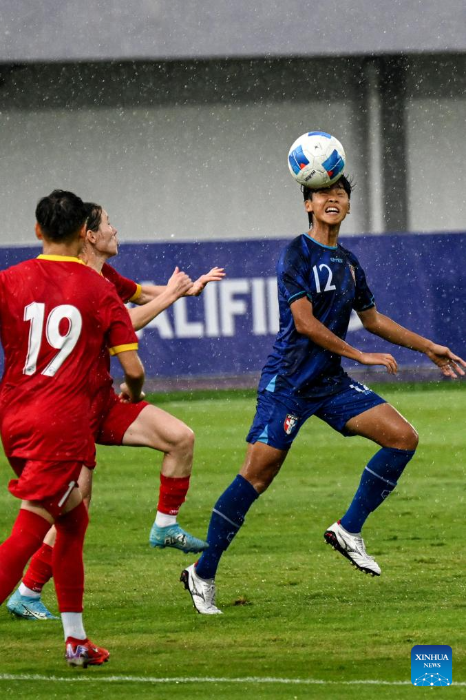 Chen Jin-Wen (R) of Chinese Taipei competes during the AFC Women's Asian Cup 2026 Qualifiers Group D football match between Kyrgyzstan and Chinese Taipei in Tangerang, Indonesia, July 2, 2025. (Xinhua/Agung Kuncahya B.)