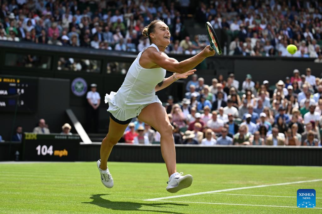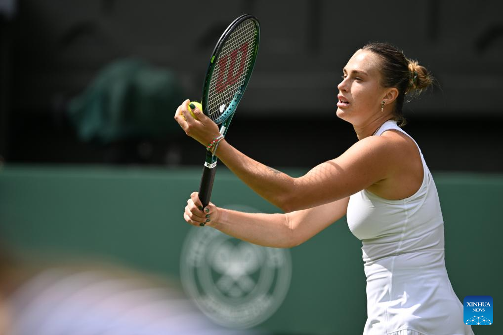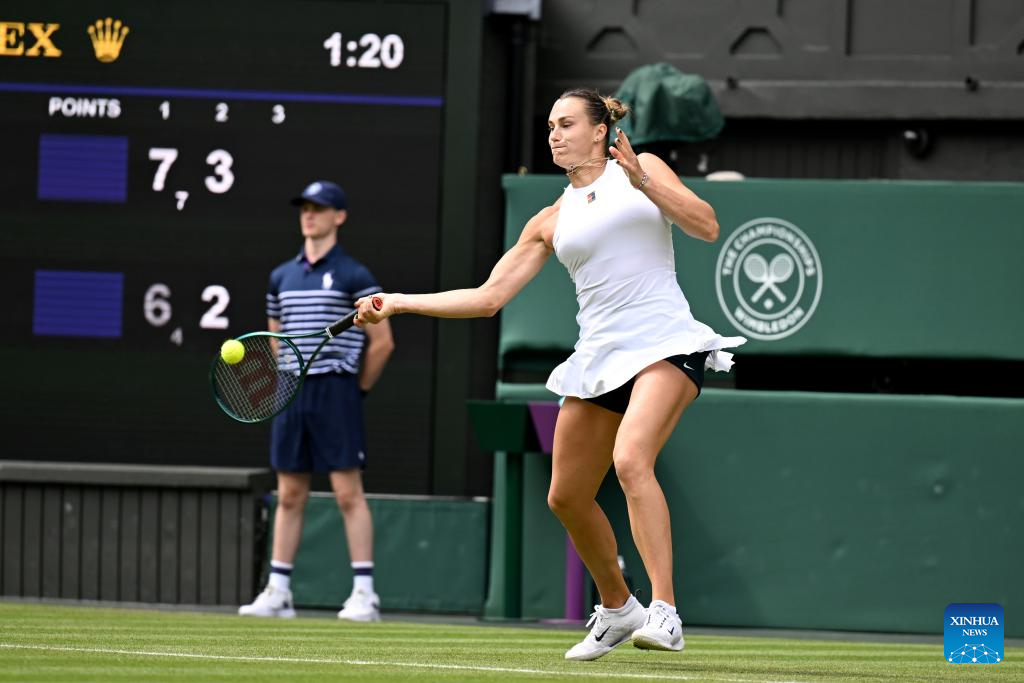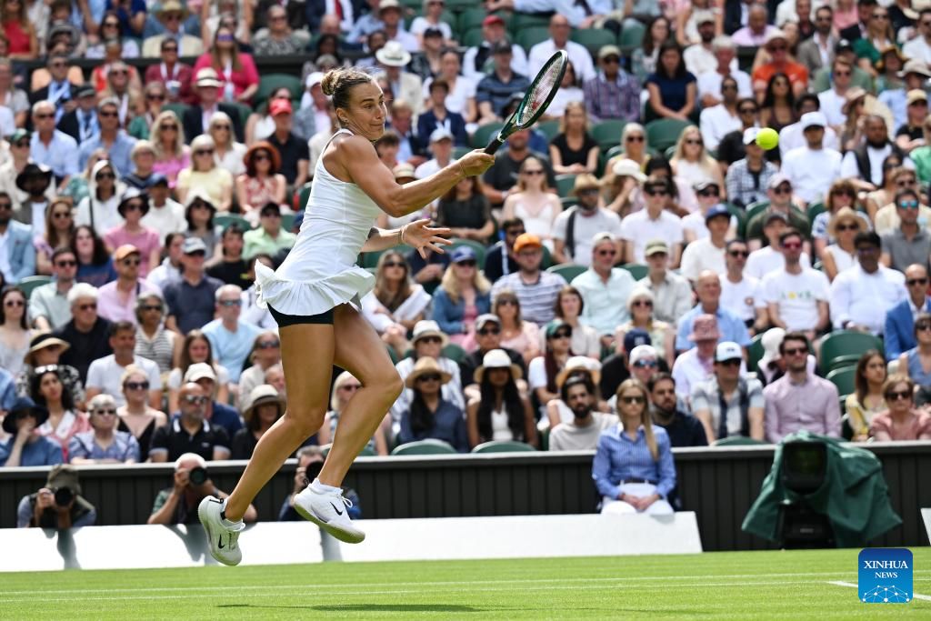 Aryna Sabalenka hits a return during the women's singles second round match between Aryna Sabalenka of Belarus and Marie Bouzkova of the Czech Republic at the Wimbledon Tennis Championships in London, Britain, July 2, 2025. (Xinhua/Zhao Dingzhe)