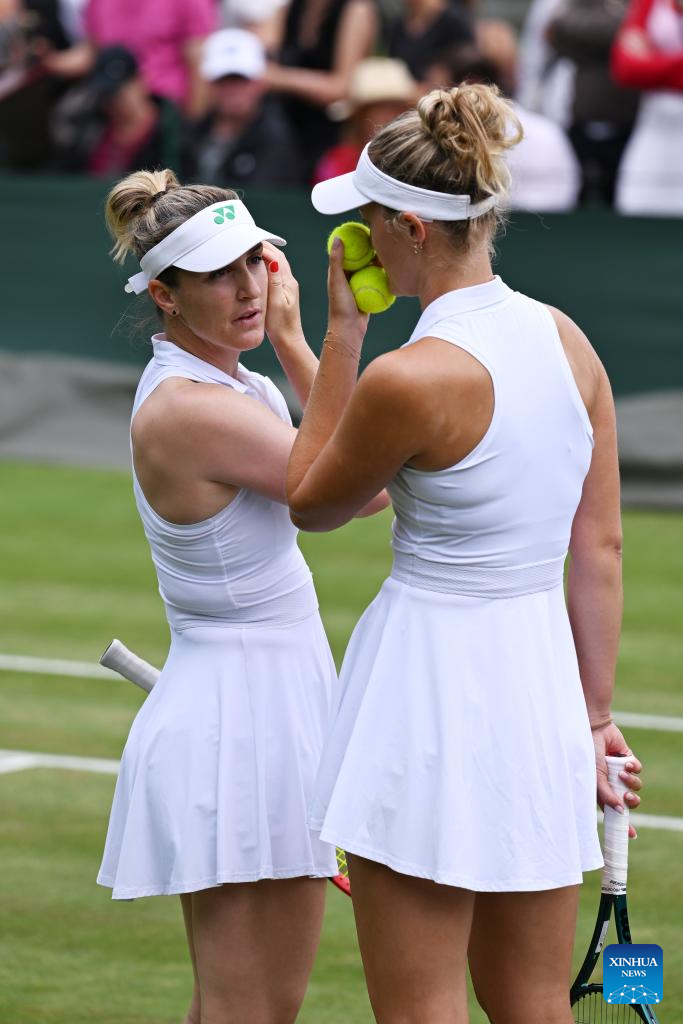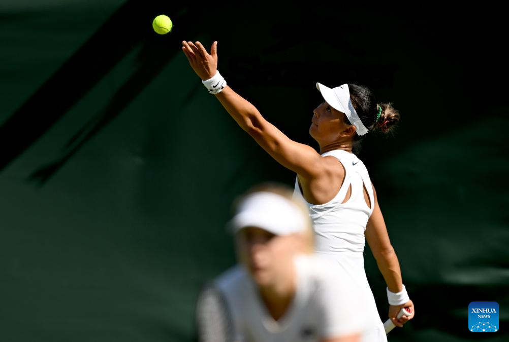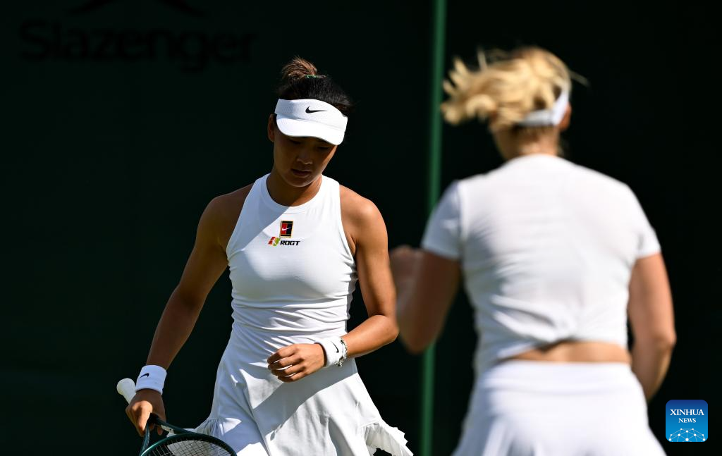 Yuan Yue (R)/Anna Blinkova compete during the women's doubles first round match between Yuan Yue (China)/Anna Blinkova (Russia) and Nicole Melichar-Martinez (the United States)/Liudmila Samsonova (Russia) at the Wimbledon Tennis Championships in London, Britain, July 2, 2025. (Xinhua/Li Ying)