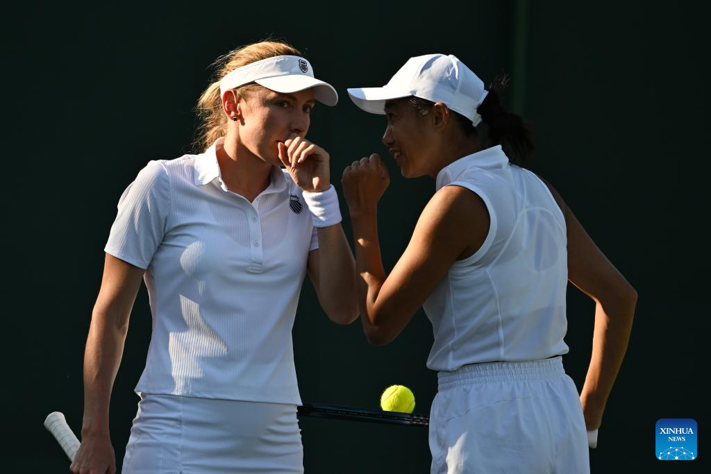 Zhu Lin/Tang Qianhui (L) communicate during the women's doubles first round match between Jiang Xinyu (China)/Wu Fang-Hsien (Chinese Taipei) and Zhu Lin/Tang Qianhui of China at the Wimbledon Tennis Championships in London, Britain, July 2, 2025. (Xinhua/Li Ying)