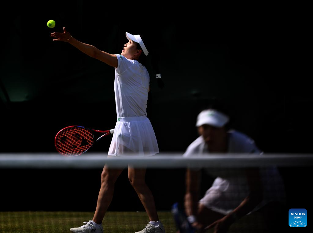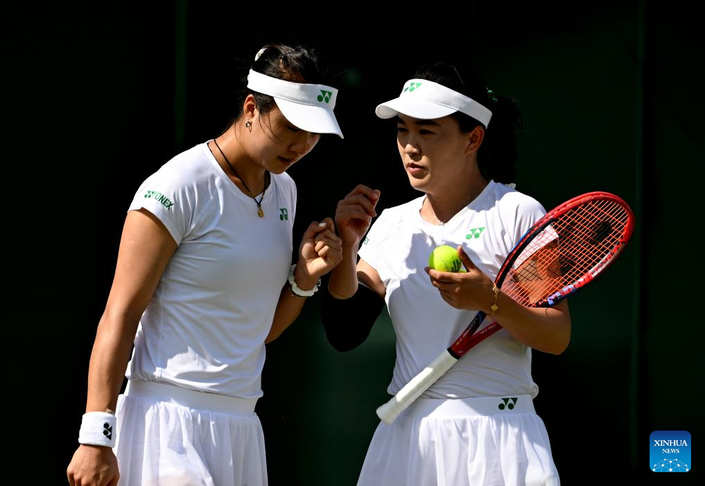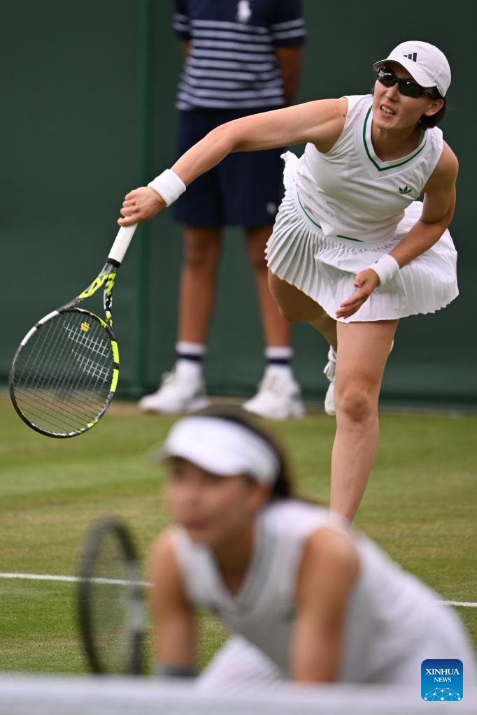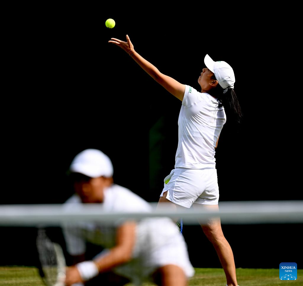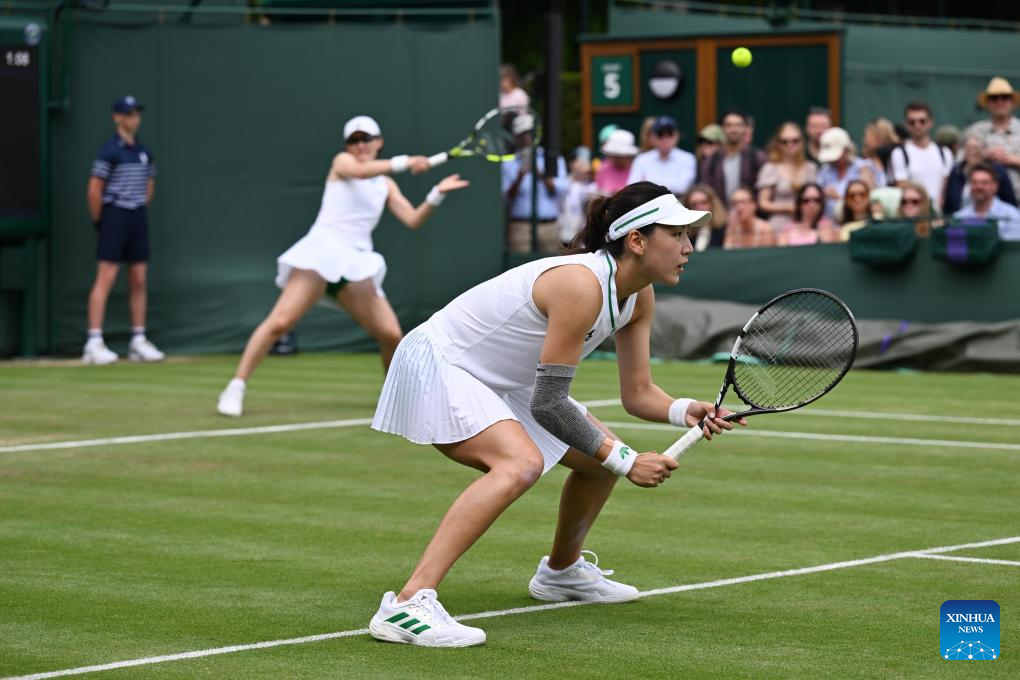 Jiang Xinyu/Wu Fang-Hsien (R) compete during the women's doubles first round match between Jiang Xinyu (China)/Wu Fang-Hsien (Chinese Taipei) and Zhu Lin/Tang Qianhui of China at the Wimbledon Tennis Championships in London, Britain, July 2, 2025. (Xinhua/Li Ying)