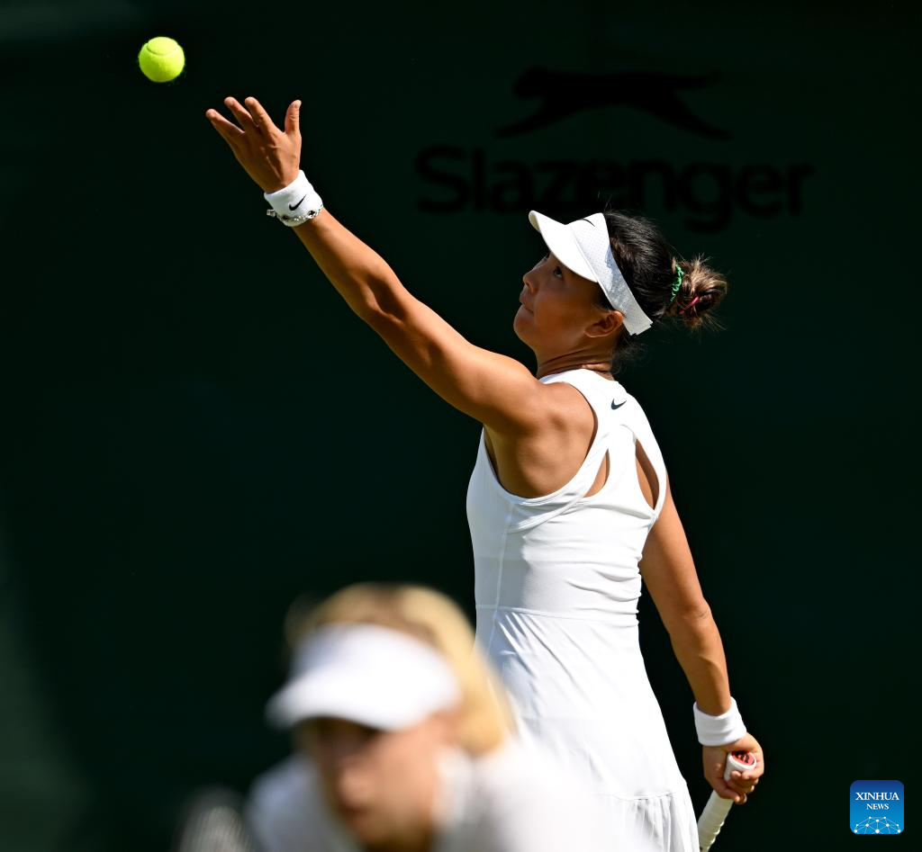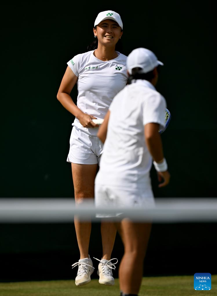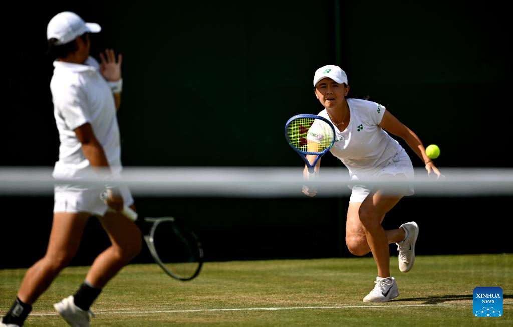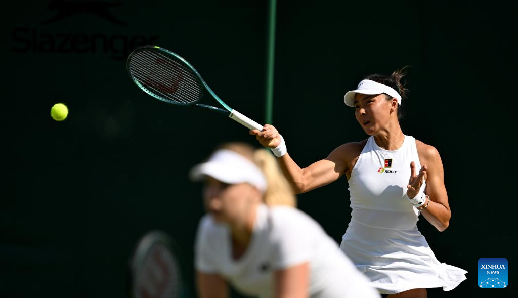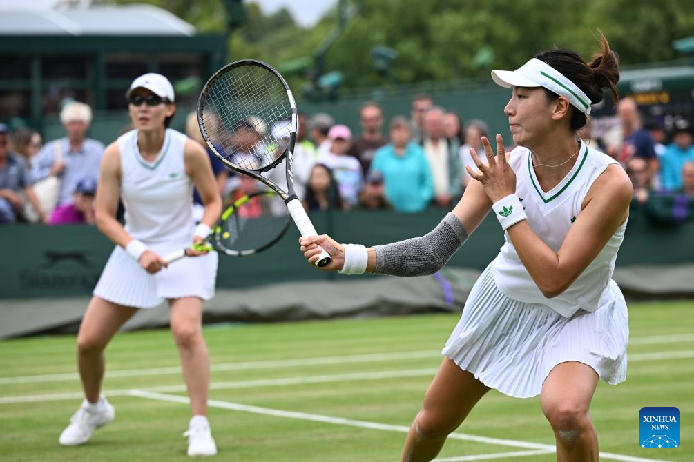 Jiang Xinyu/Wu Fang-Hsien (R) compete during the women's doubles first round match between Jiang Xinyu (China)/Wu Fang-Hsien (Chinese Taipei) and Zhu Lin/Tang Qianhui of China at the Wimbledon Tennis Championships in London, Britain, July 2, 2025. (Xinhua/Li Ying)