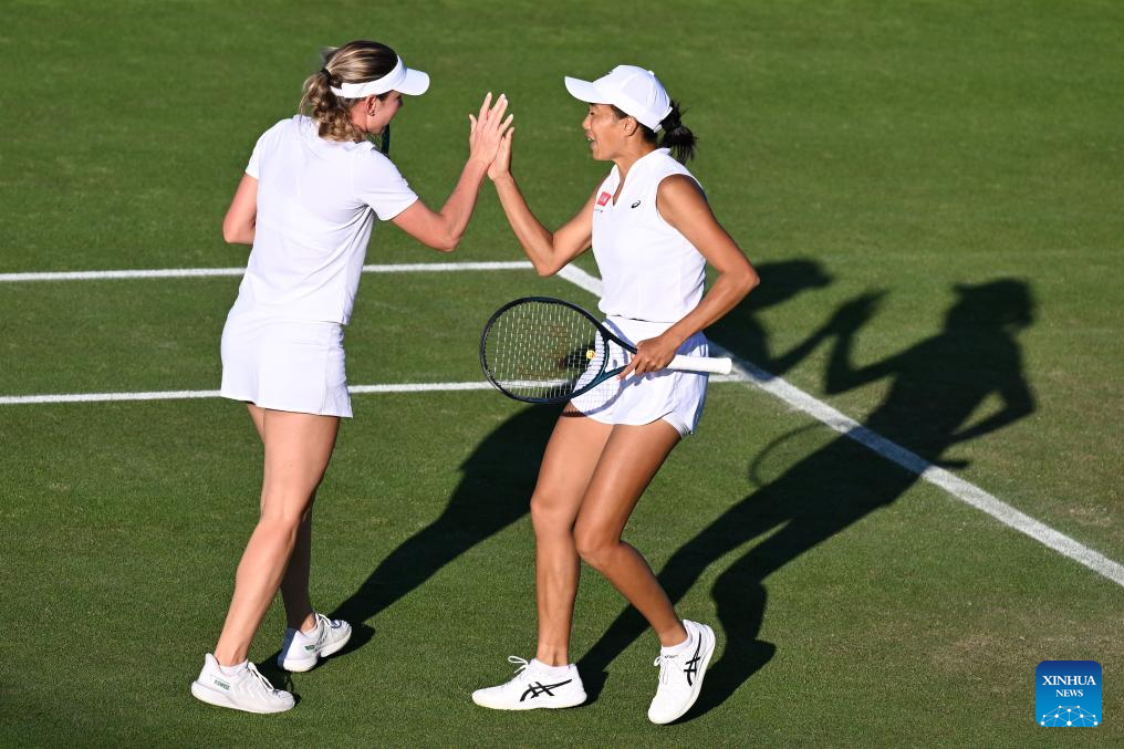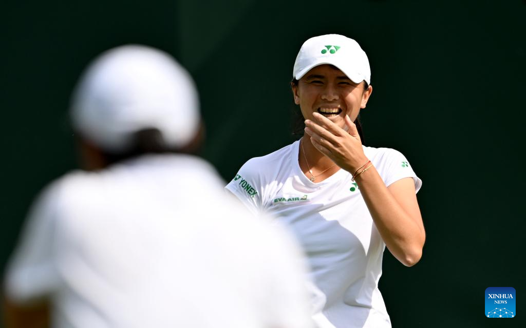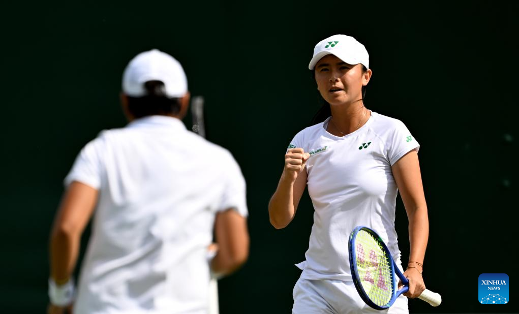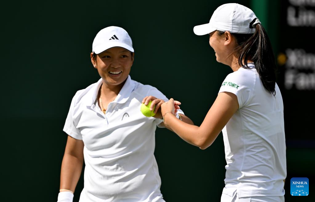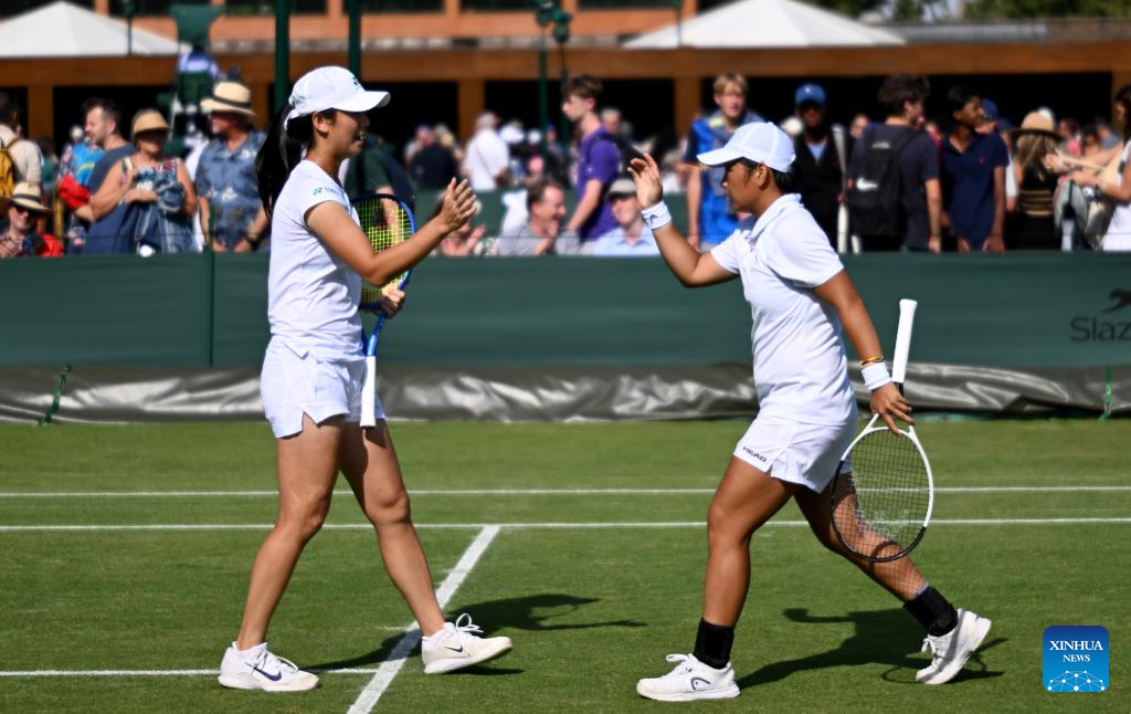 Jiang Xinyu/Wu Fang-Hsien (L) celebrate after winning the women's doubles first round match between Jiang Xinyu (China)/Wu Fang-Hsien (Chinese Taipei) and Zhu Lin/Tang Qianhui of China at the Wimbledon Tennis Championships in London, Britain, July 2, 2025. (Xinhua/Li Ying)