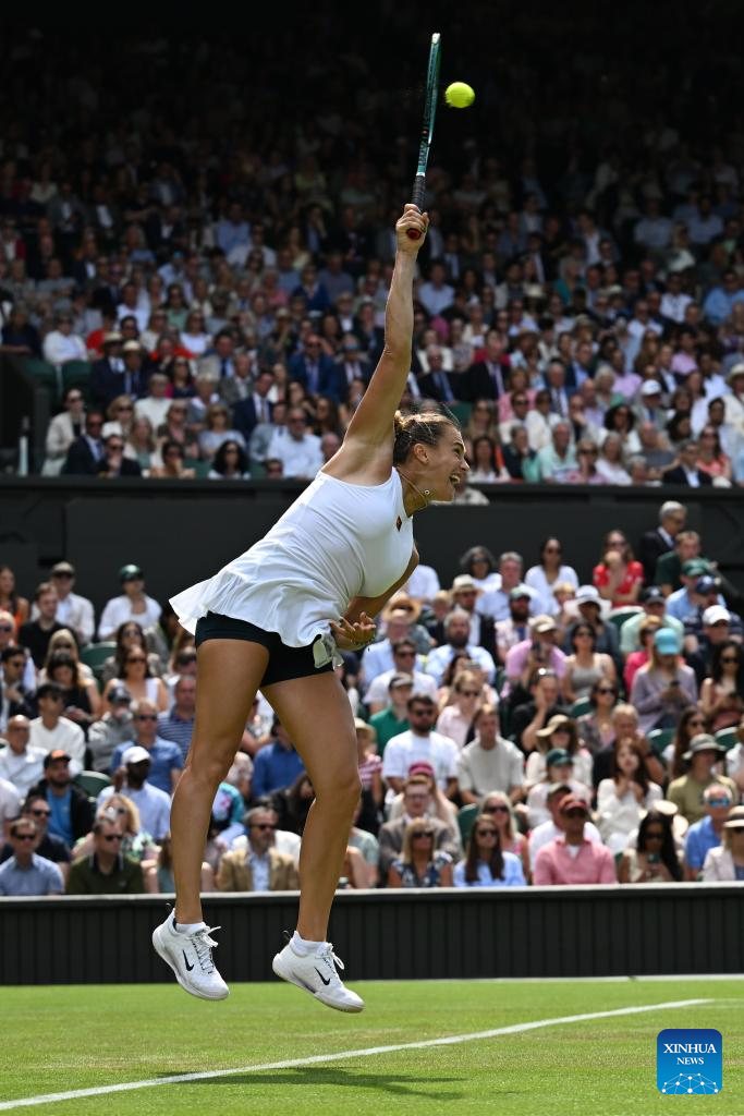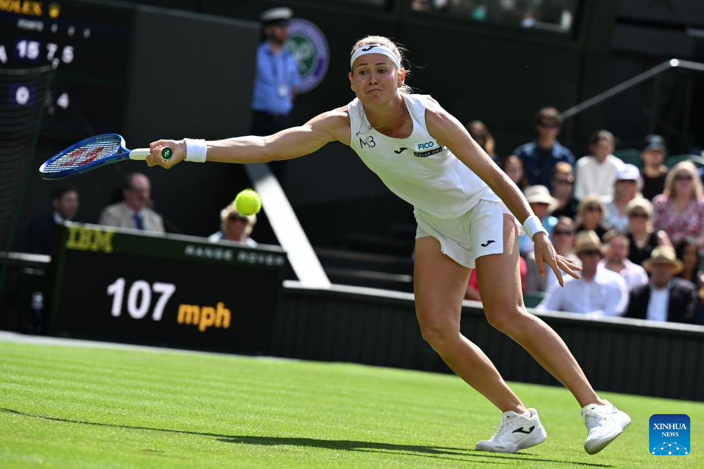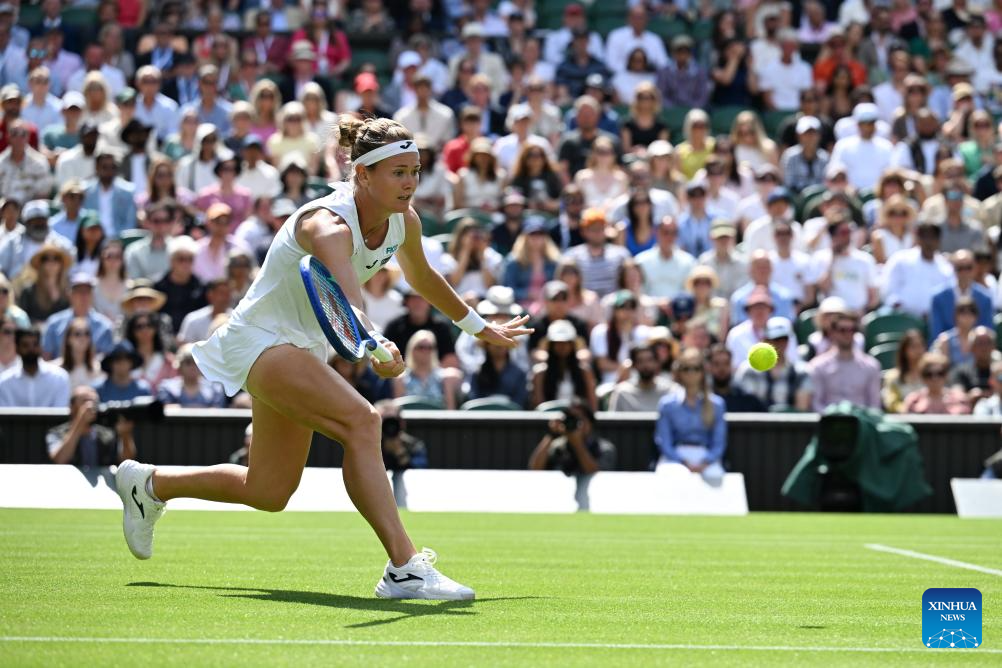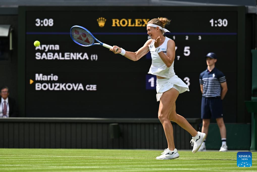 Marie Bouzkova hits a return during the women's singles second round match between Aryna Sabalenka of Belarus and Marie Bouzkova of the Czech Republic at the Wimbledon Tennis Championships in London, Britain, July 2, 2025. (Xinhua/Zhao Dingzhe)