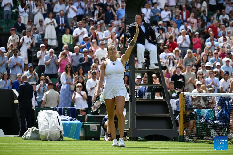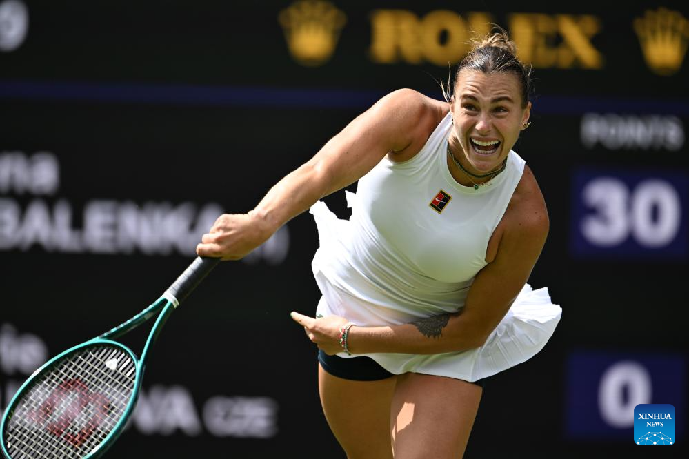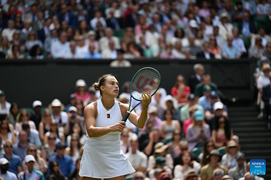 Aryna Sabalenka competes during the women's singles second round match between Aryna Sabalenka of Belarus and Marie Bouzkova of the Czech Republic at the Wimbledon Tennis Championships in London, Britain, July 2, 2025. (Xinhua/Zhao Dingzhe)