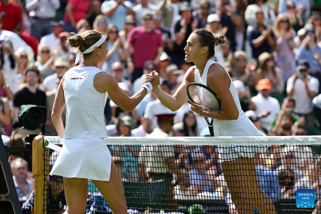 Aryna Sabalenka (R) greets Marie Bouzkova after the women's singles second round match between Aryna Sabalenka of Belarus and Marie Bouzkova of the Czech Republic at the Wimbledon Tennis Championships in London, Britain, July 2, 2025. (Xinhua/Zhao Dingzhe)